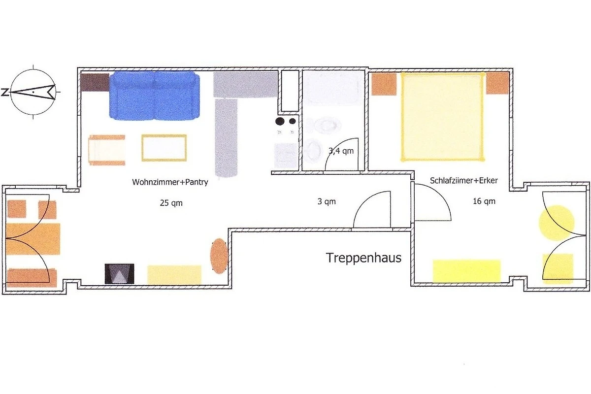 Ausser dem kombinierten Ess- und Wohnzimmer mit offener Küchenzeile gibt es einen abgetrennten Schlafraum mit geräumigem Doppelbett mit geteilten Matratzen (jeweils 90 x 200 cm). Und ein verglaster zweiter Erker schliesst sich nach Süden an. Er eignet sich zum Lesen und Entspannen in der Nachmittagssonne. In diesem Erker kann auch gut ein Kinderreisebett stehen. Im Wohnraum steht eine bequeme Couch – hierher könnte auch mal ein schnarchender Partner ausweichen (das Laken müsste dann eine Grösse von 140 x 200 cm aufweisen)! Es handelt sich um eine Nichtraucher-Wohnung; Haustiere sind nicht erlaubt. Unterstellmöglichkeit für Ihre mitgebrachten Fahrräder sind im Keller.