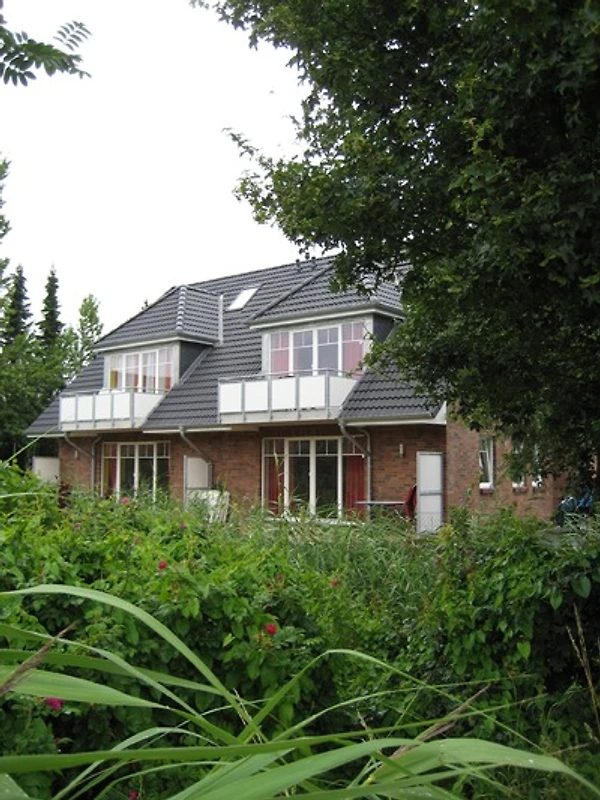 Eine Waschmaschine steht allen 4 Wohnungen gemeinsam zur Verfügung, ebenso ein Grillkamin auf der Wiese im hinteren Teil des Grundstückes. Vor dem Haus gibt es genügend Platz, um mitgebrachte oder geliehene Fahrräder abzustellen. Ihnen steht ein Parkplatz direkt vor dem Haus zur Verfügung.
