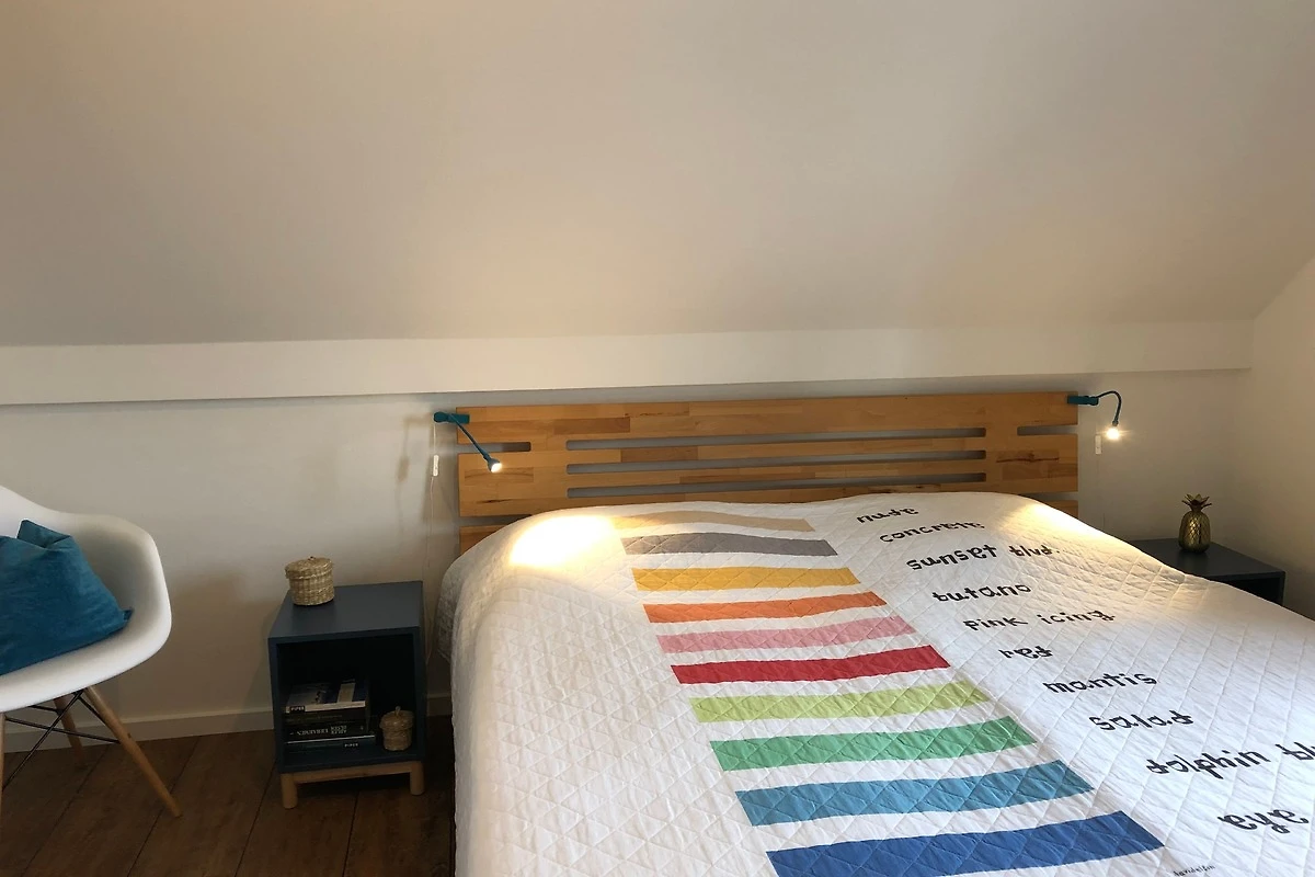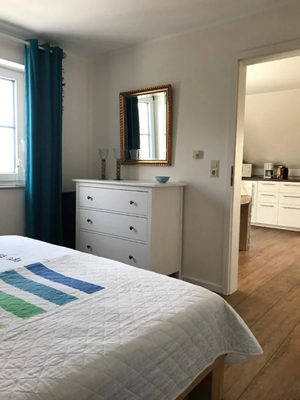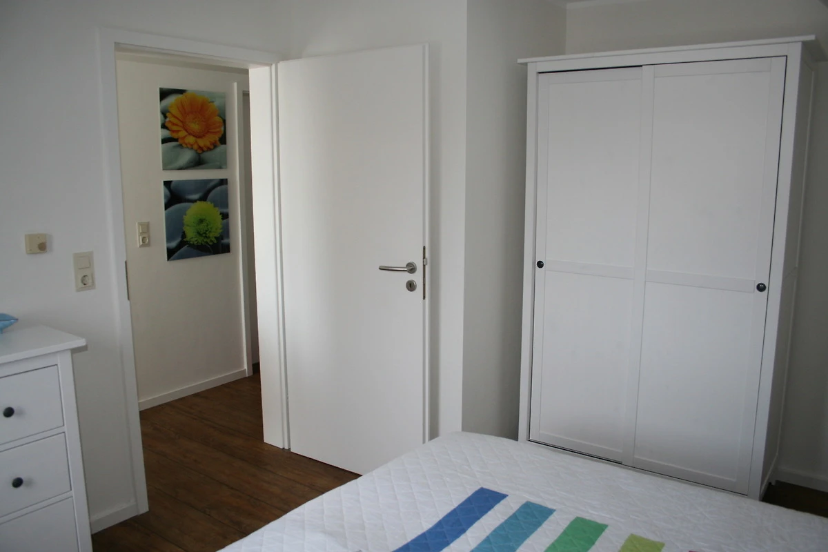 Das ebenfalls hell gestaltete Schlafzimmer hat ein gemütliches Doppelbett aus geölter Buche (1,80m breit).