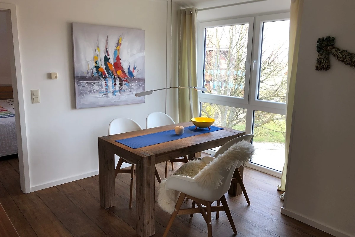 Gemütliche, voll ausgestattete Wohnung mit moderner Einrichtung und geschütztem Balkon im Obergeschoss eines Hauses mit insgesamt 4 Ferienwohnungen. Sehr ruhige Lage, dennoch Ortskern mit Restaurants, Hafen und Ostseeufer mit wenigen Schritten erreichbar. Kein direkter Seeblick. PKW-Parkplatz und Abstellmöglichkeit für Fahrräder vorhanden. Ideal für 2 Personen.