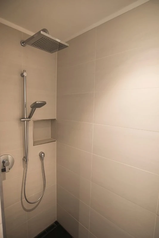 ebenerdigen Dusche mit Regenbrause und einem kombiniertem Waschtrockner versehen.