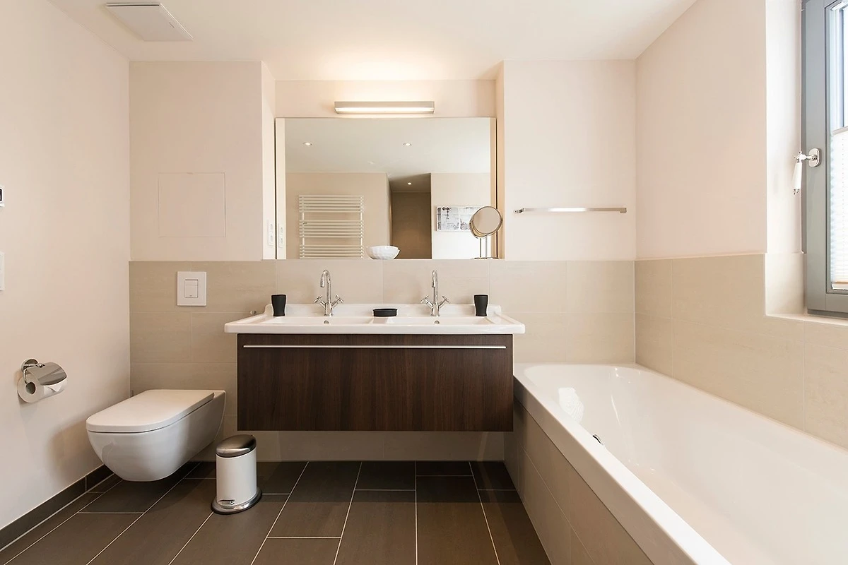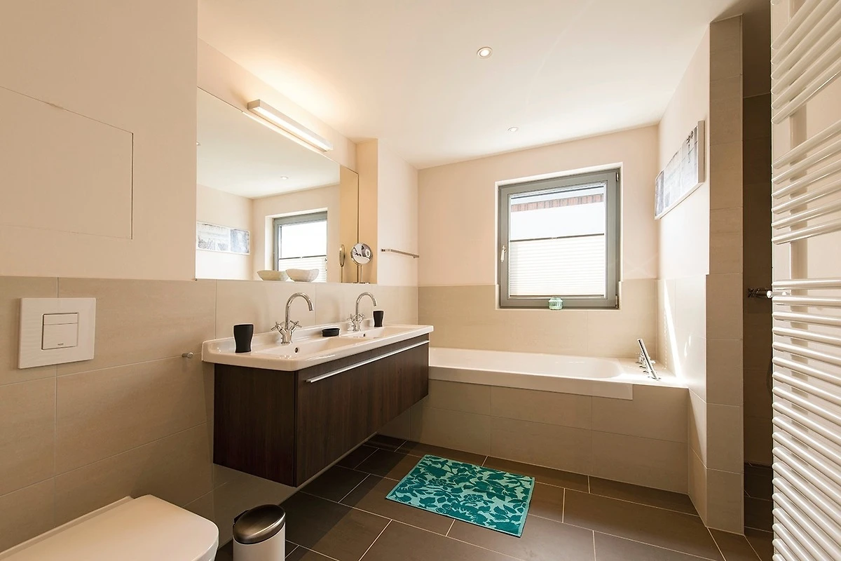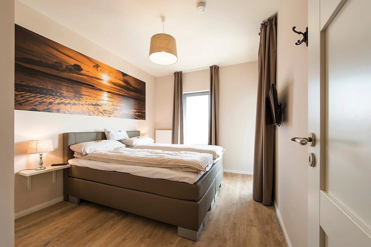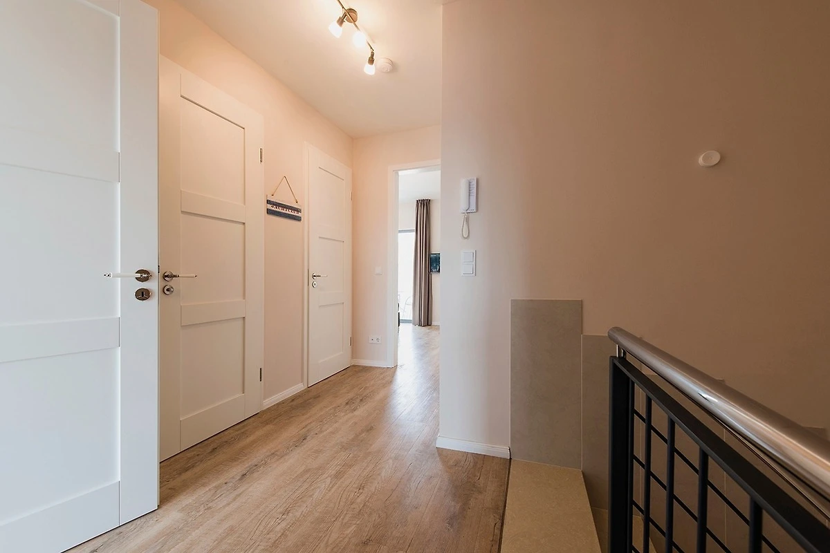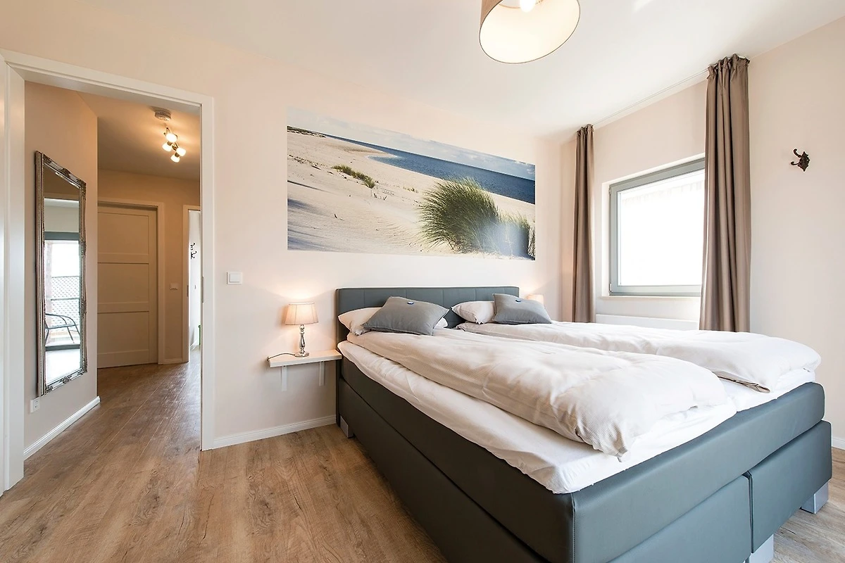 Im Obergeschoss gelangen Sie aus allen 3 Schlafzimmern auf den Balkon bzw. die Loggia, die Loggia lockt mit einem Ausblick auf den Yachthafen, der Balkon verwöhnt Sie in der Abendsonne mit einem Ausblick auf den Binnensee. Alle Schlafzimmer sind mit Boxspringbetten, TV und genügend Stauraum ausgestattet und können über Black-Out-Vorhänge komplett verdunkelt werden. Das Wellness-Bad verfügt über eine Badewanne, Dusche und einen Doppelwaschtisch. In einem separaten Abstellraum finden Sie eine Waschmaschine/Trockner gegen Gebühr.