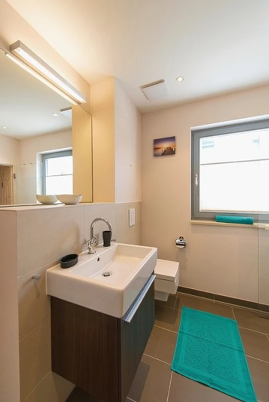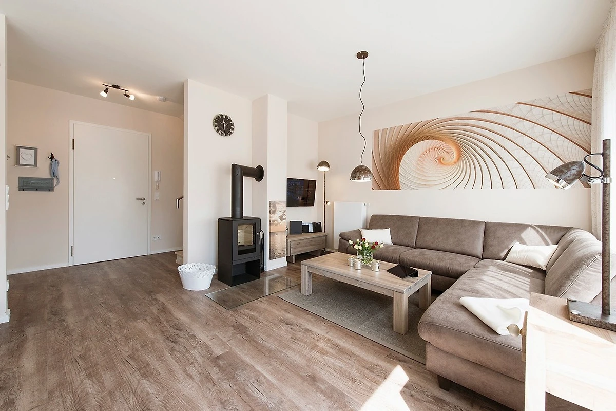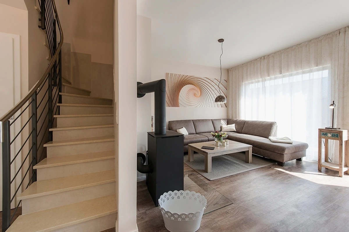 Im Erdgeschoss finden Sie einen grosszügigen Wohn-/Essbereich mit offener Küche. An einem grossen Tisch ist viel Platz, in der hochwertigen Küche ist an alles gedacht! Wir freuen uns auch auf unsere "kleinen Gäste". Zur kinderfreundlichen Ausstattung gehört ein Kinderhochstuhl, Kinderporzellan und Kinderbesteck, Bücher, Spiele sowie ein gemütliches Babybett mit separater Matratze. Die Sofaecke mit Kamin lädt zum entspannten Verweilen ein. Vom Wohnzimmer gelangen Sie auf eine voll ausgestattete Terrasse, von der Sie auf den Yachthafen blicken können. Das EG-Bad verfügt über eine Dusche und einen integrierten Saunabereich - ideal zum Entspannen nach langen Strandspaziergängen.