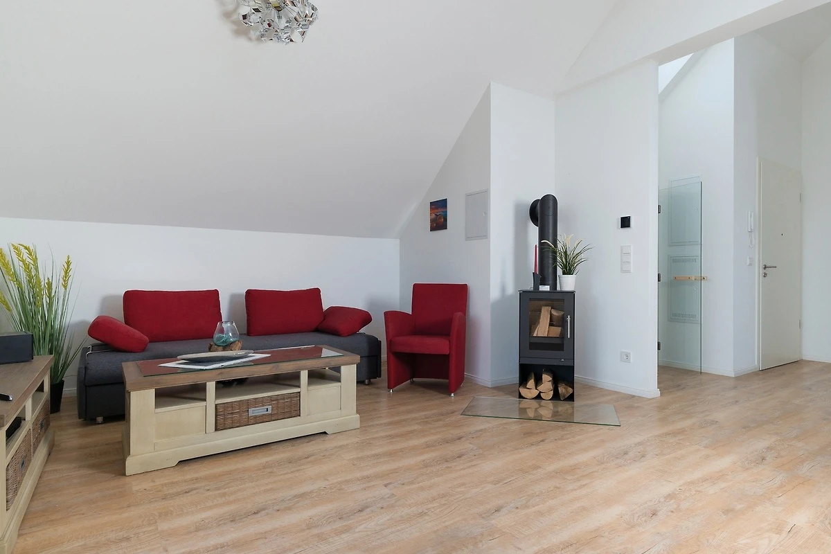 Die Wohnung ist mit hochwertigen Möbeln im Landhausstil ausgestattet. Sie besteht aus einem Schlafzimmer, einem Wohn- und Esszimmer mit integrierter Küche und einem Bad mit Dusche.