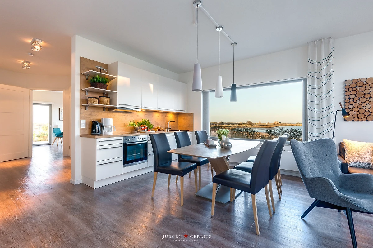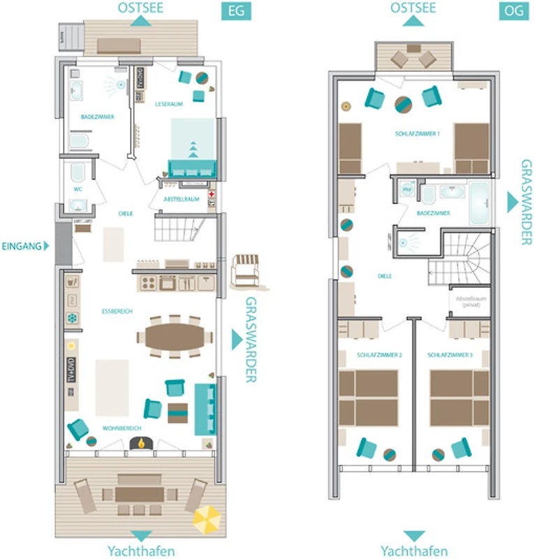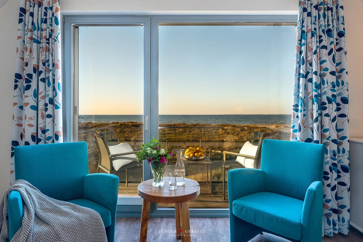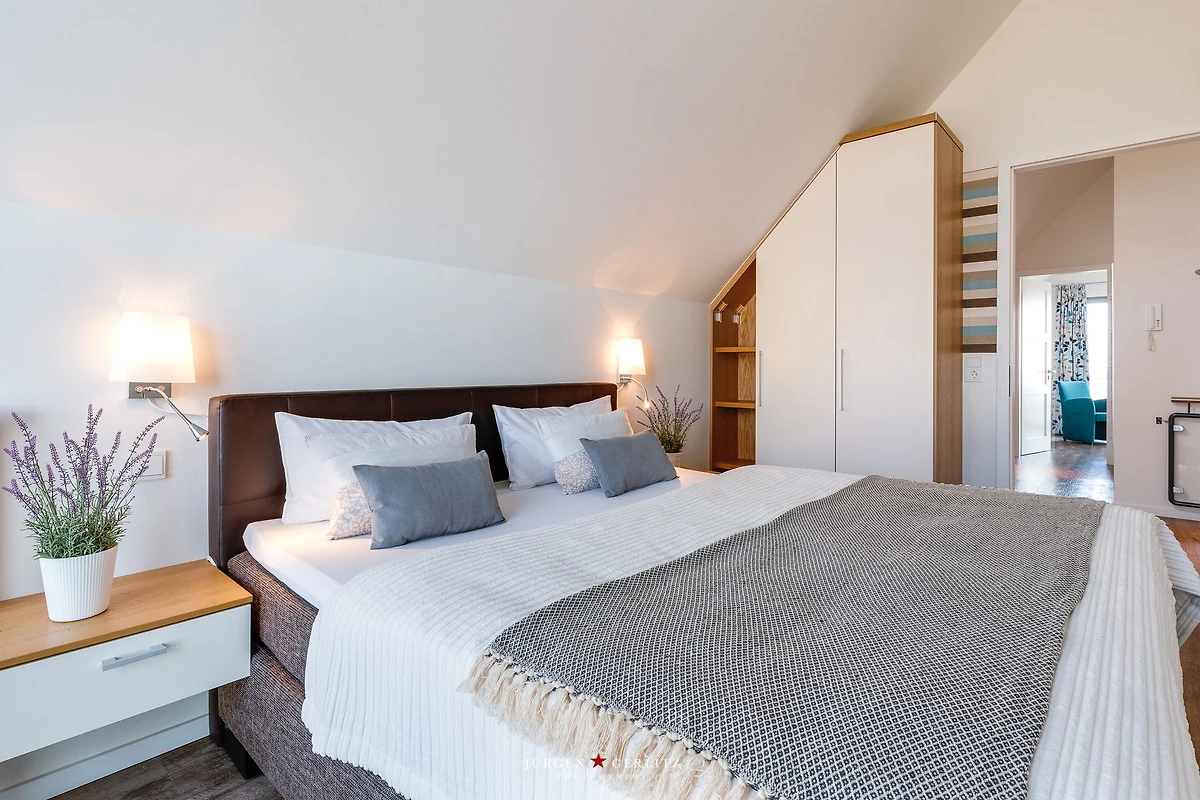 Im Obergeschoss befinden sich drei Schlafräume sowie ein komfortables Badezimmer (WC/Badewanne/grosse Dusche/Waschmaschine), von dem aus man einen malerischen Ausblick auf Graswarder und Fehmarnsundbrücke hat. Zwei nach Süden ausgerichtete Schlafzimmer eröffnen mit ihren raumhohen Panoramafenstern Perspektiven in den Yachthafen. Sie sind jeweils mit grossen Boxspring-Doppelbetten (180x200 cm) ausgestattet. Weiteres Highlight ist das zur Ostsee gelegene, mit zwei Boxspring-Einzelbetten (140x200 cm und 90x200 cm) versehene Schlafzimmer. Der grosszügige Raum lädt mit bequemen Sesseln an der grossen, bodentiefen Fensterfront auch sonst zum Verweilen ein und bietet mit seinem Balkon dazu noch ein exklusives Aussenerlebnis: über Strand und Ostsee gelegen kann man hier den Blick von der Seebrücke über Fehmarn zum Graswarder schweifen lassen und dazu in den Sommermonaten noch atemberaubende Sonnenuntergänge ins Meer erleben! Und: Wer länger wach bleibt oder ganz früh ist, kann die Sonne dort sogar wieder aufgehen sehen...