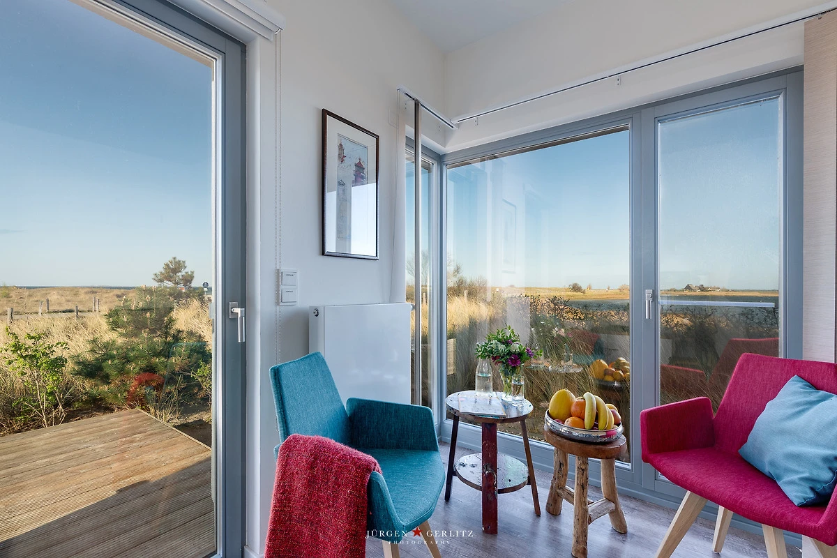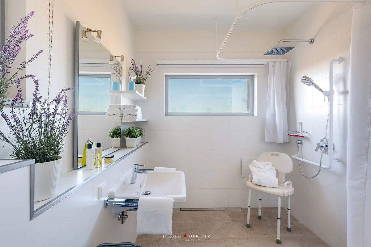 Zurück in der Diele findet sich linker Hand ein Gäste-WC sowie ein geräumiges, rollstuhlgerechtes Bad (WC mit Klappgriffen, befahrbare Dusche mit Haltestange, Duschsitz und Duschstuhl/unterfahrbares Waschbecken etc.). Der Lese- und Ruheraum ist mit kleiner Sitzecke einschliesslich TV, Blue-Ray-Player und HiFi-Anlage ausgestattet und lädt zum Verweilen mit Blick auf die Dünen, Strand, Ostsee und Graswarder ein. Das komfortable Sofa kann dabei mit einem Griff in eine bequeme Liege- und Ruhemöglichkeit (Matratze 140x200 cm) umgewandelt werden. Diesem Raum schliesst sich ebenfalls eine Terrasse an – hier bietet die rustikale Teakbank einen weiteren Bestplatz mit Ausblick!