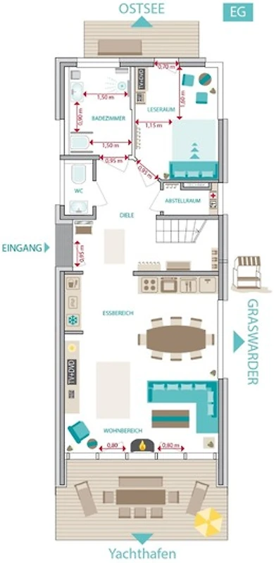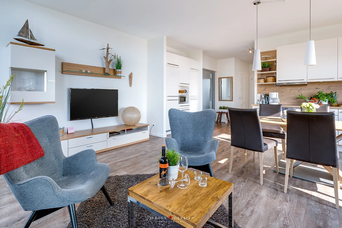 Das Haus verfügt über einen eigenen PKW-Stellplatz unmittelbar am Aufgang. Zum Strand, zur Erlebnis-Seebrücke, zum Yachthafen oder zu den Einkaufs- und gastronomischen Möglichkeiten im Strand Resort sind es nur wenige Schritte. Auch der Fischereihafen und das historische Stadtzentrum von Heiligenhafen mit seinen vielfältigen Geschäften sind in ca. 8-10 Minuten fussläufig zu erreichen.