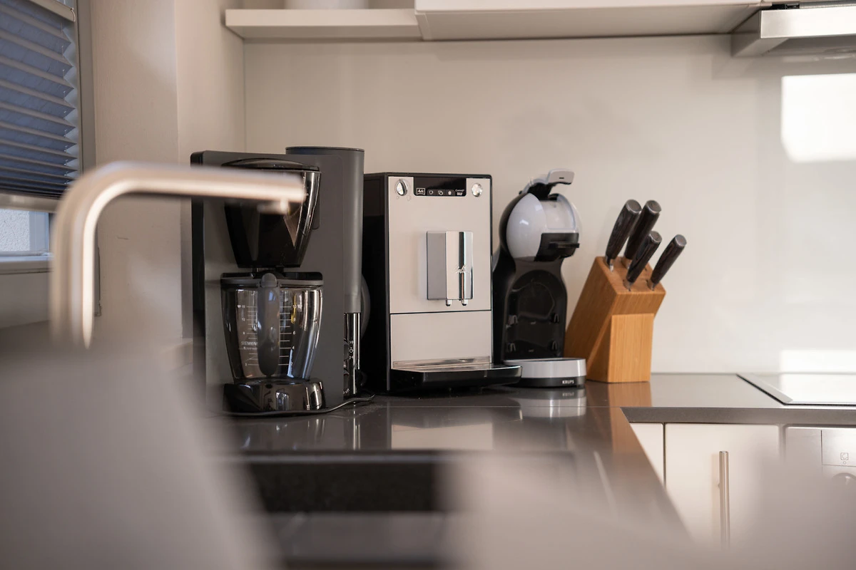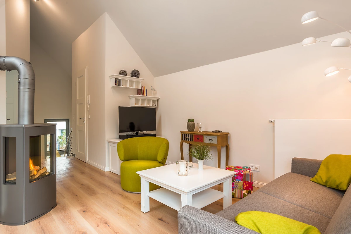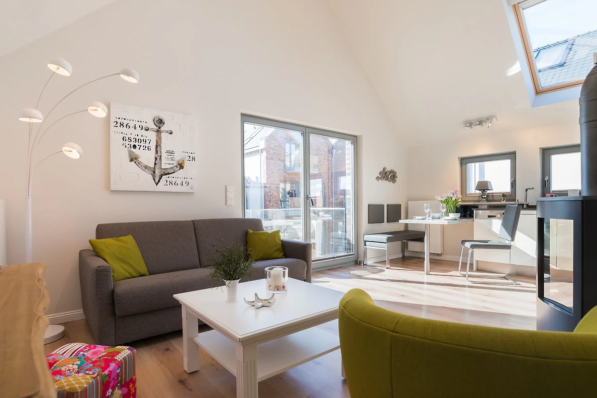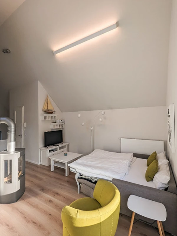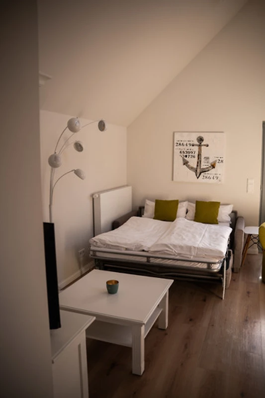 Im Wohnzimmer steht ein hochwertiges Schlafsofa, dass eine Aufbettung von zwei weiteren Personen ermöglicht.