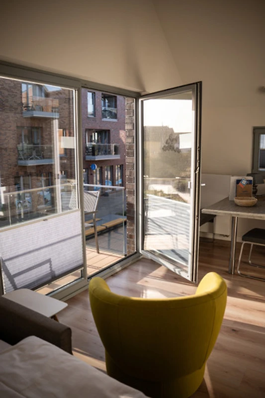 Das Schlafzimmer ist mit einem hochwertigen Boxspringbett für Ihren erholsamen Schlaf eingerichtet. Vom Schlafzimmerbalkon haben Sie einen Ausblick auf die Ostsee und den Hafen.