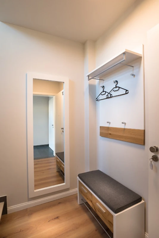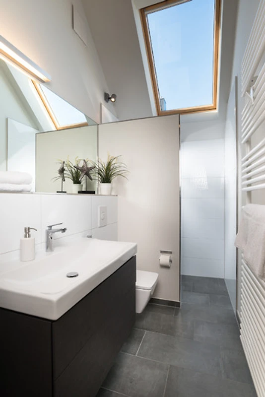 Das Badezimmer ist exklusiv ausgestattet und verfügt über eine grosse Dusche. Genügend Stauraum finden sie in den Schränken sowie im Abstellraum, wo sich auch ein Waschtrockner befindet.