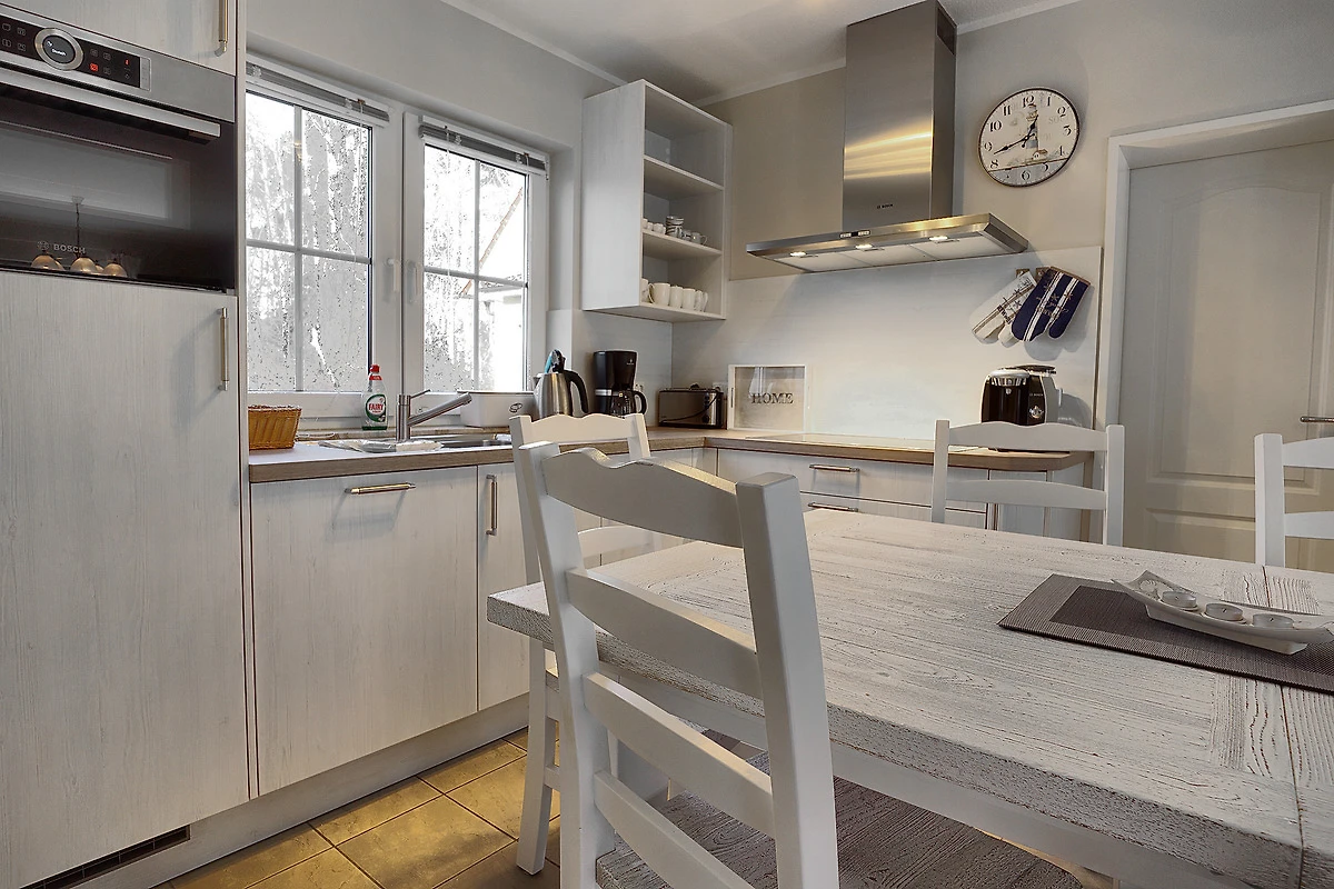 Die gut ausgestattete Küche besitzt unter anderem einen Kühlschrank, einen Herd zum Kochen und sogar eine Spülmaschine.