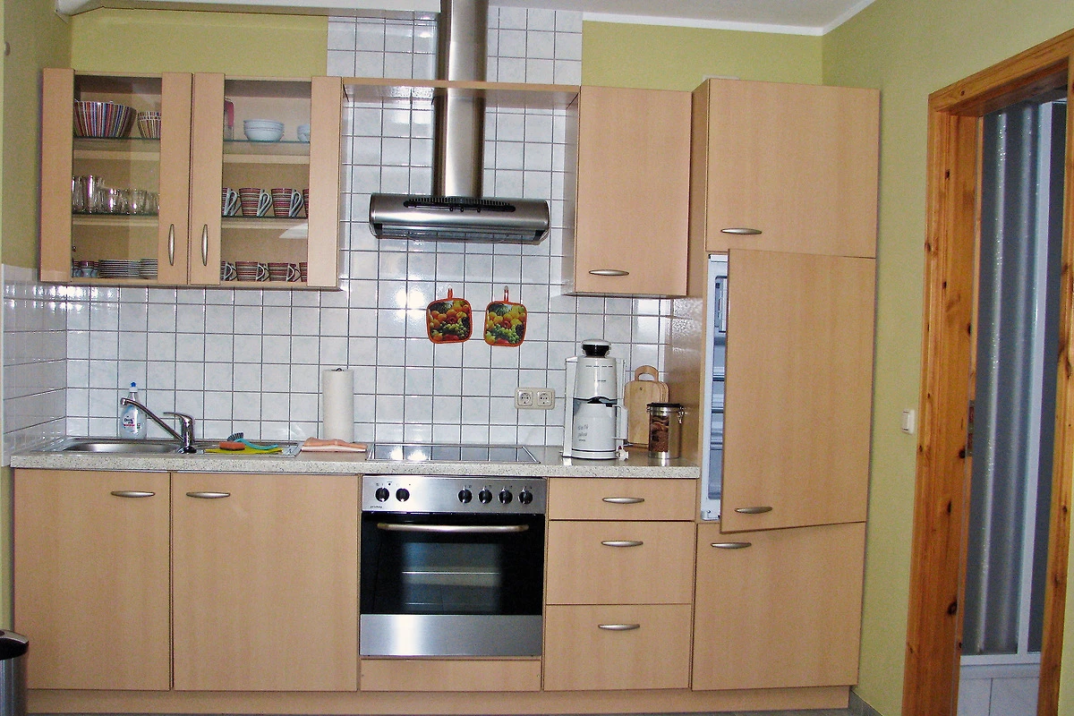 In der gut ausgestatteten Küche finden Sie neben einem Kühlschrank auch eine Mikrowelle und einen Backofen.