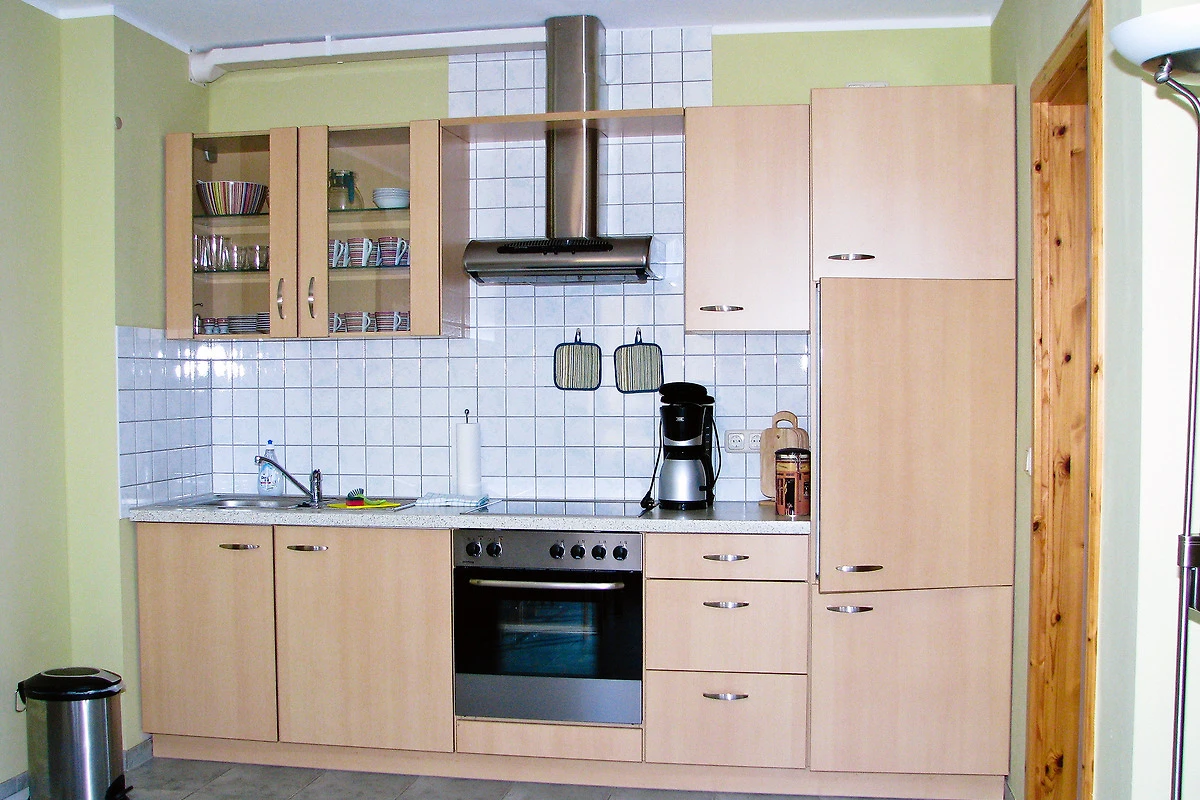 In der gut ausgestatteten Küche finden Sie neben einem Kühlschrank auch eine Mikrowelle und einen Backofen.