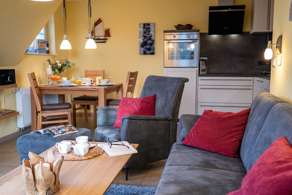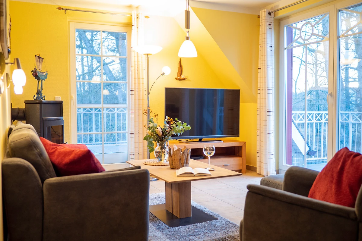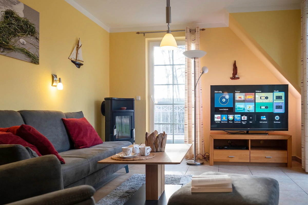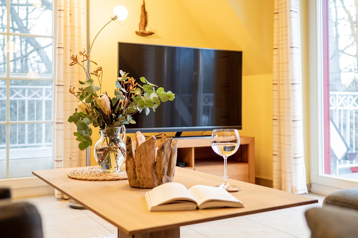 Sie bietet für 2Personen ein gemütliches Ambiente und ist liebevoll und hochwertig eingerichtet. Im Wohnzimmer sorgt ein 55"- Flachbildschirm für Fernseh-Vergnügen, das Schlafzimmer verwöhnt Sie mit einem 50"- Flachbildschirm. Ein Kaminofen im Wohnzimmer sorgt für behagliche Wärme an kalten Tagen. Das exklusive Bad ist mit einer Fussbodenheizung ausgestattet. Die Wohnung besitzt 2 grosse Balkone ( Süd - und Westlage ) mit Blick ins Grüne. Beide Balkone sind mit bequemen, verstellbaren Klappstühlen mit Liegefunktion, Fusshocker, Tisch und Sonnenschirm ausgestattet. Ebenfalls zur Wohnung gehört ein eigener Abstellraum für Fahrräder und Strandutensilien. Kostenloser WLAN-Anschluss.