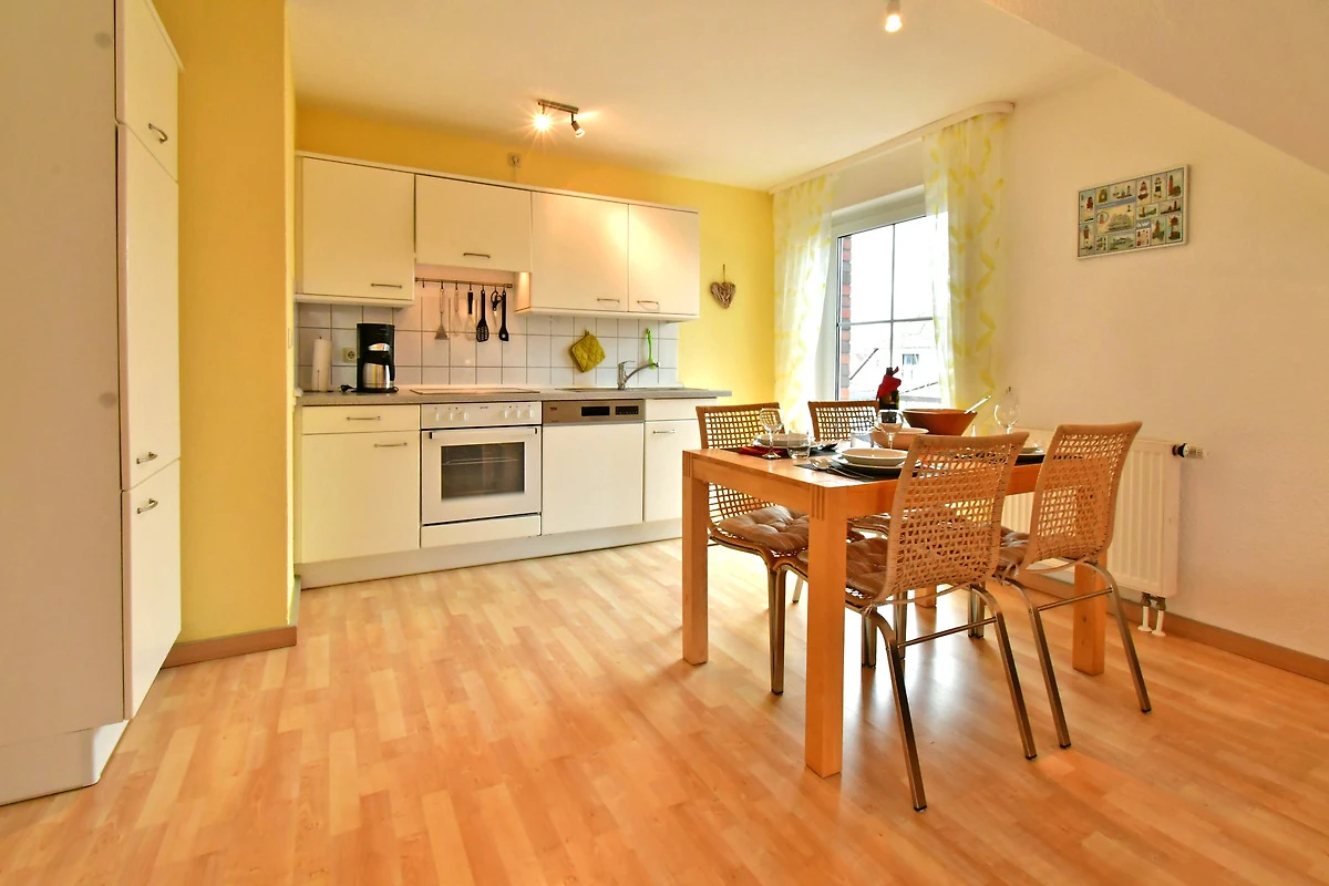 Die Küche besitzt einen Kühlschrank mit Gefrierfach, einen Herd mit Ceranfeld und Backofen, sowie einen Geschirrspüler. Diverse elektrische Geräte runden das Angebot ab.