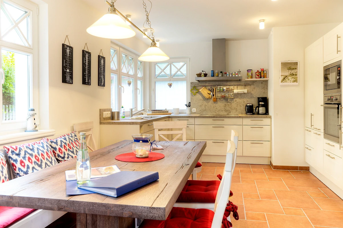 Die Küche ist komplett ausgestattet mit Geschirrspüler, Hochbackofen, Mikrowelle, Kühlschrank ,Wasserkocher, Kaffeemaschine und Toaster .