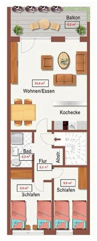 Urlaubsgrüsse über soziale Netzwerke versenden? Mit unserem kostenfreien W-LAN klappt das bei uns ganz schnell. Sowohl Familien als auch Pärchen kommen hier ganz auf ihre Kosten - denn durch zwei Schlafzimmer mit separaten Betten bietet es sowohl für Eltern mit zwei Kindern als auch für vier Erwachsene genügend Platz und Rückzugsmöglichkeiten für einen erholsamen Urlaub. Der grössere der beiden Räume ist mit zwei hochwertigen Hotelbetten ausgestattet, die sich leicht zu einem Doppelbett zusammenschieben lassen. Das grosszügige und freundlich eingerichtete Wohnzimmer verfügt neben dem Essbereich über eine gemütliche Sitzecke und einen Flachbildfernseher, sodass ein angenehmes Ambiente für einen abendlichen Couch- oder Spieleabend garantiert ist. Auf der Fensterbank wohnt die Figur eines Wikingers, der das Appartement seinen Namen verdankt. Der angrenzende, windgeschützte Balkon bietet genügend Platz, um Ostseeluft und Sonne zu geniessen und lädt zum Verweilen ein. Nur ein Tresen trennt den Wohnbereich von der offenen, unter anderem mit Spülmaschine, Backofen und Kaffeevollautomat bestückten Küche und komplettiert die Ausstattung für einen entspannten Urlaub! Das helle Badezimmer wird durch eine Kuppel an der Decke mit Tageslicht durchflutet und wartet mit geräumiger Dusche und Fussbodenheizung auf. Zur Wohnung gehört darüber hinaus ein schliessbarer Abstellbereich, der perfekt für die Aufbewahrung Ihrer Sportgeräte wie Fahrräder oder Surfbretter geeignet ist. In einem kleinen Tresor, der sich in dem kleineren der beiden Schlafräume befindet, können Sie Ihre Wertsachen auch während des Strandaufenthalts sicher aufbewahren. Der PKW-Stellplatz befindet sich direkt auf dem Grundstück der Ferienwohnung und stellt somit ein bequemes Be- und Entladen Ihres Reisegepäckes sicher. Bitte haben Sie Verständnis dafür, dass das Laden von e-Autos, Wohnmobilen und Campern über den Hausstrom nicht gestattet ist. Wir weisen darauf hin, dass diese Leistungserbringung keinen Vertragsbestandteil darstellt. Bei Nichteinhaltung wird eine entsprechende Mehrvergütung verlangt.