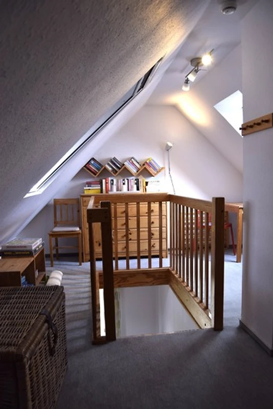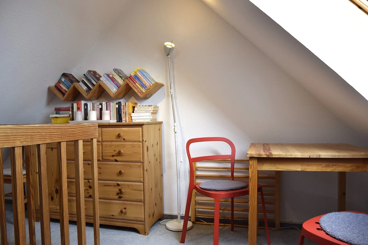 Das NICHTRAUCHER-Appartement ist zwar offiziell (nach Wohnflächenverordnung und wegen der Dachschrägen) "nur" 42 m² gross, wirkt und ist aber eigentlich wesentlich grösser. Es verfügt über 2 Zimmer im 2. OG des Appartementhauses, eine Galerie (im 3. OG) erreicht man vom Wohnraum aus über eine Treppe. Diese ist teilweise offen zum Wohnraum. Hier befindet sich ein Tandembett und es ist genügend Platz zum Spielen der Kinder. Der Raum mit Blick Richtung Ostsee kann auch als Rückzugsort für Erwachsene genutzt werden.
