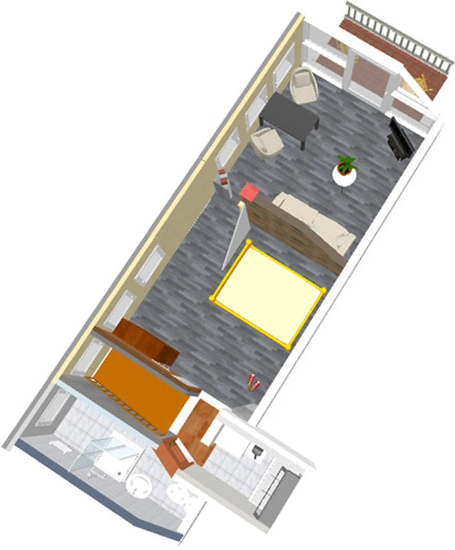 Das "Brückendeck" ist ausgestattet mit einem komfortablen Boxspring-Federkern-Sofa, zwei Ledersessel mit Tisch und ein 180x200 cm Doppelbett. Selbstverständlich verfügt das Apartment über ein vollwertiges Duschbad, WC, Handwaschbecken und Haartrockner, sowie einer Kombüse, in der auf zwei Kochfeldern bzw. der Mikrowelle das Essen bereitet werden kann. Die Küche ist ausserdem mit ausreichend Geschirr, Besteck, Spülbecken, Toaster, Wasserkocher und Kaffeemaschine ausgestattet.