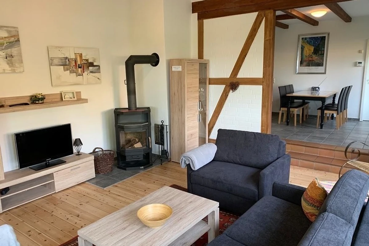 Die Doppelhaushälfte ist gemütlich eingerichtet. Geniessen Sie an kühleren Abenden im Wohnzimmer das Prasseln im Kaminofen.