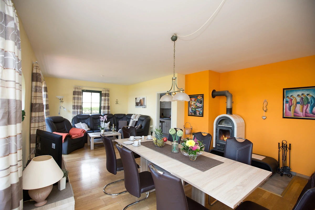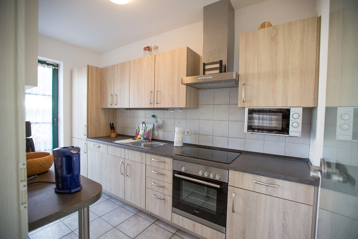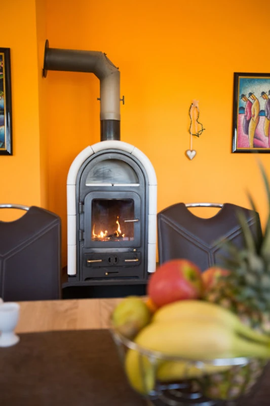 1 Schlafzimmer, Küche, Wohnzimmer mit Schlafsofa und gemütlichem Kaminofen, 1 Badezimmer, Terrasse und Garten