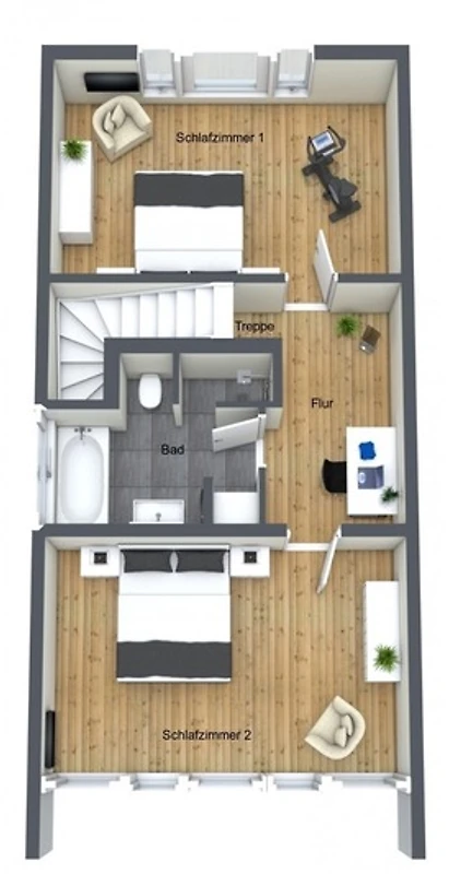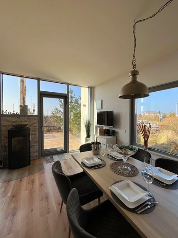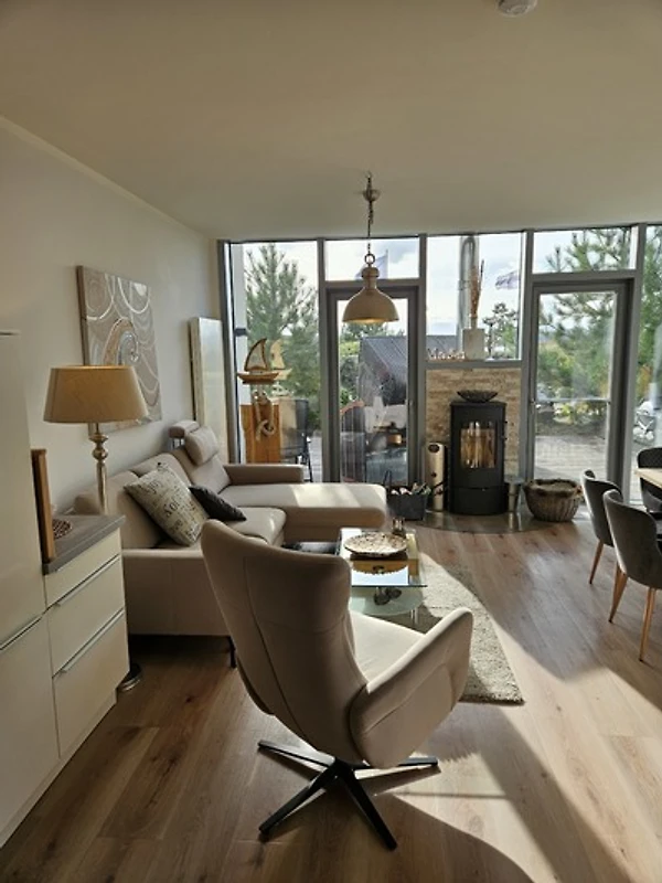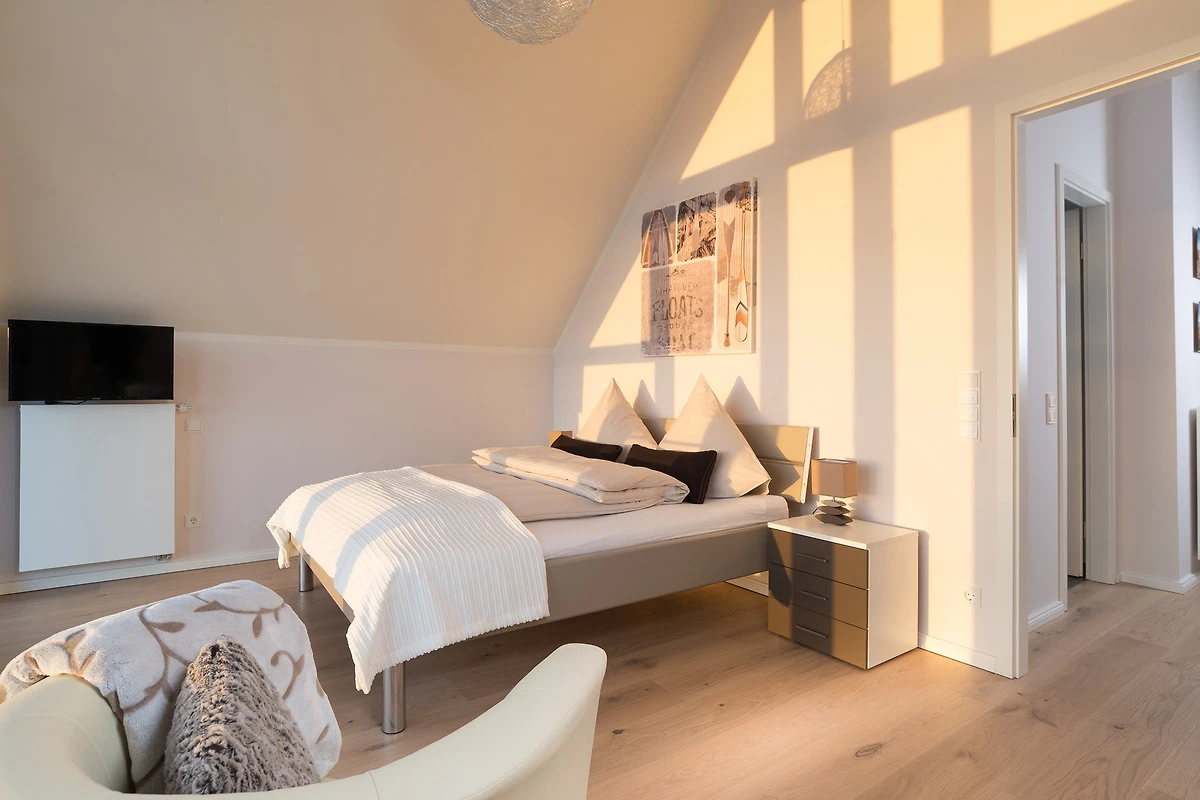 Zwei Schlafzimmer im Obergeschoss bieten Platz für 4 Personen. Alle Schlafzimmer sind mit Parkettfussboden ausgelegt. Das Schlafzimmer mit einmaligen Blick auf den Binnensee verfügt über ein Doppelbett (180/200), bodentiefen Fenstern und Flat Screen TV. Das zweite Schlafzimmer verfügt über ein Doppelbett (180/200),einen Flat Screen TV und einer grossen Fensterfront, die einen grosszügigen Blick in die Dünenlandschaft erlaubt. Das dritte Zimmer im Erdgeschoss verfügt über eine moderne Schlafcouch für 2 Personen (144/202).