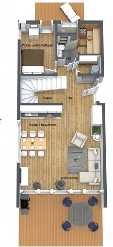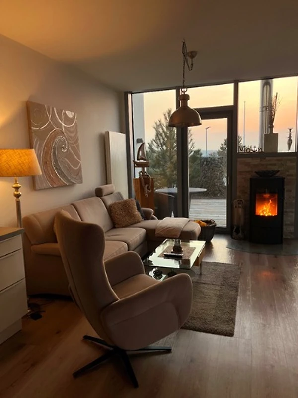 Im Erdgeschoss befindet sich eine Diele wie auch das gemütliche Wohnzimmer mit Kamin, internetfähigem Flat Screen TV und Stereoanlage. In der angrenzenden, offenen Küche, die mit modernen Geräten (Backofen, Mikrowelle, Kaffeemaschine, Geschirrspüler,) ausgestattet ist, sollte es an nichts fehlen. Am grossen Esszimmertisch finden 6 Personen Platz. Ebenso befindet sich neben einem Abstellraum eine finnische Sauna mit bodengleicher Dusche und ein Gäste-WC. Im angrenzenden Relax-Raum können Sie sich entspannen. Aus dem Wohnzimmer gelangen Sie auf die grosse, möblierte Süd-/Westterrasse mit herrlichem Blick auf den Binnensee.