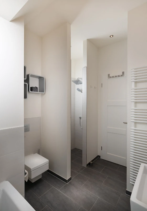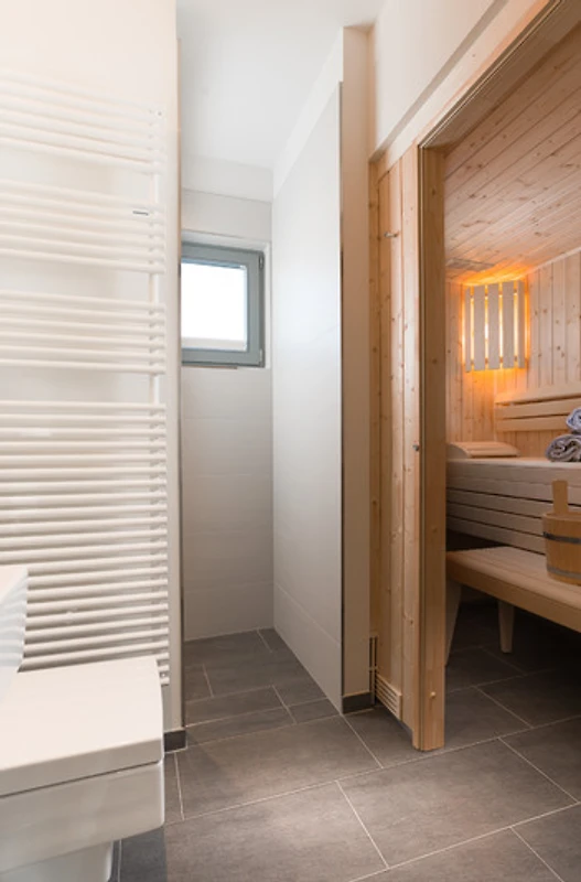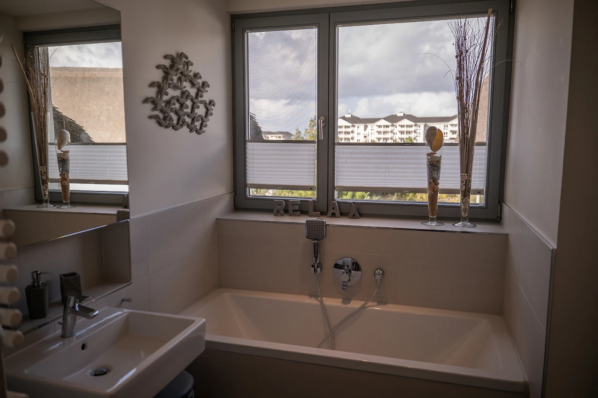 Vom Badezimmer mit bodengleicher Dusche, grossem Waschtisch und Badewanne haben Sie einen schönen Blick auf die Ostsee. Ausserdem befindet sich dort in einer separaten Ecke eine Waschmaschine.