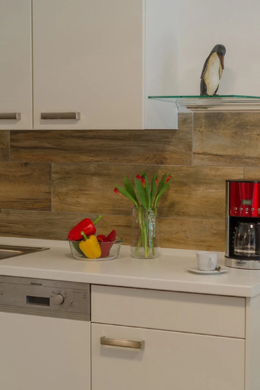Die gut ausgestattete Küche besitzt unter anderem einen Kühlschrank, einen Herd zum Kochen und sogar eine Spülmaschine.