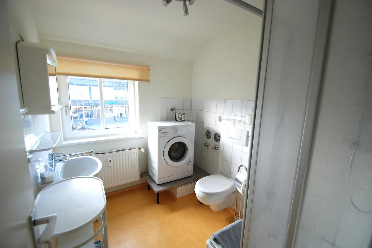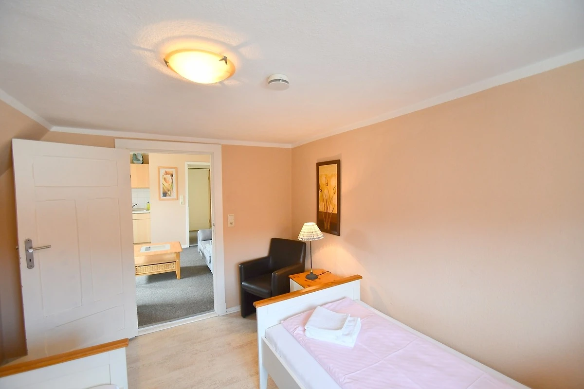 Die Wohnung "Hafen" im Gästehaus am Schiffbrückenplatz verfügt über ein Schlafzimmer mit zwei Einzelbetten, einen Wohnraum mit integrierter Küchenzeile, zwei Sessel mit Couchtisch, Esstisch, Flur und ein Duschbad. Zusammen bieten diese Räumlichkeiten auf etwa 40 m² im 2. Obergeschoss auch für längere Aufenthalte ein behagliches Wohngefühl.