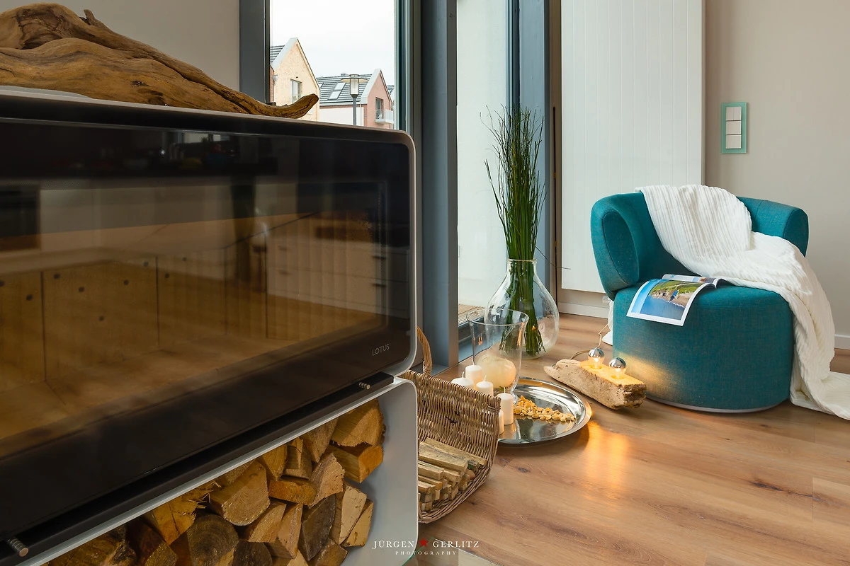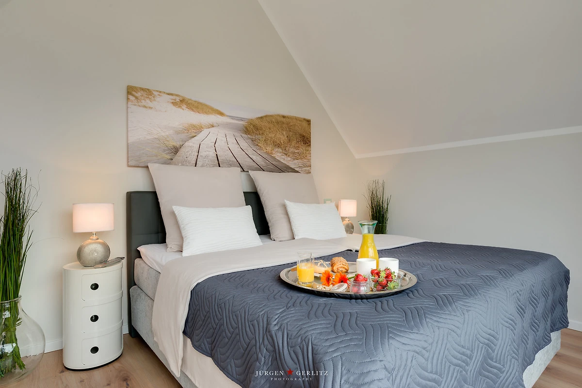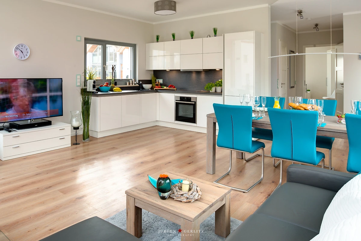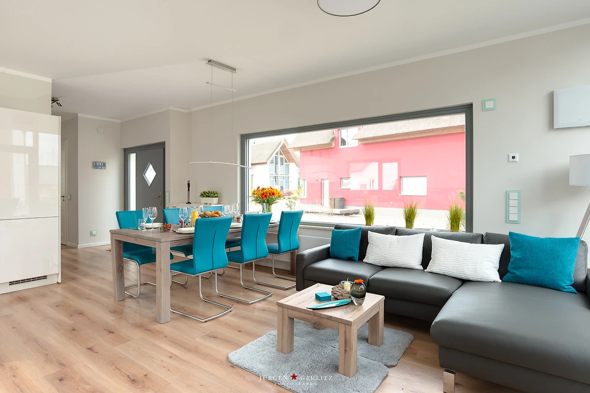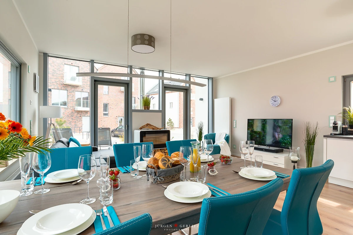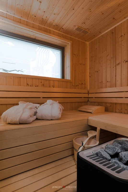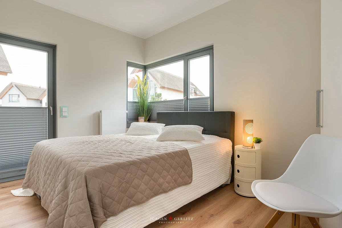 Ein Highlight des Einzelhauses ist der luxuriöse Wohnbereich mit offener Küche und Panoramablick. Hier kann man wirklich von in einer "Wohnlandschaft" sprechen. Der in Erdtönen und mit hochwertigen Materialien gestaltete Raum verschmilzt mit dem Meer und den Dünen, die sich vor der bodentiefen Glasfront erstrecken. In der mit Ceranherd, Kühlschrank, Backofen und Spülmaschine ausgestatteten Qualitätsküche lassen sich auch grössere Menüs zaubern. Vor dem Essen ein paar Gänge in der hauseigenen Sauna, anschliessend ein Glas Wein vor dem flackernden Feuer des Kamins, während draussen die Ostsee ihr Nachtlied singt. So wurde hier auf ca. 137 qm Wohnfläche, verteilt auf Erdgeschoss und Dachgeschoss, die Idee vom perfekten Ferienhaus am Meer verwirklicht. Hier dürften die Ferien nie zu Ende gehen!
