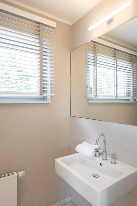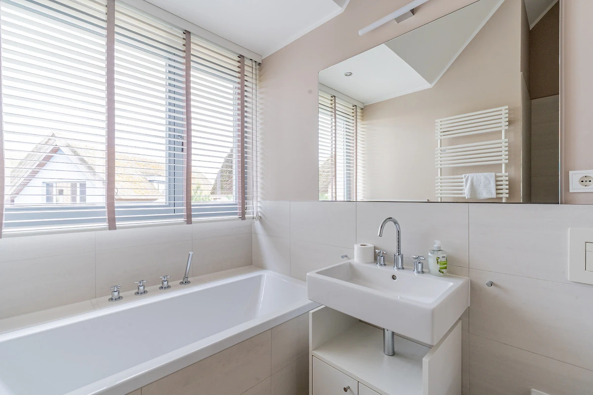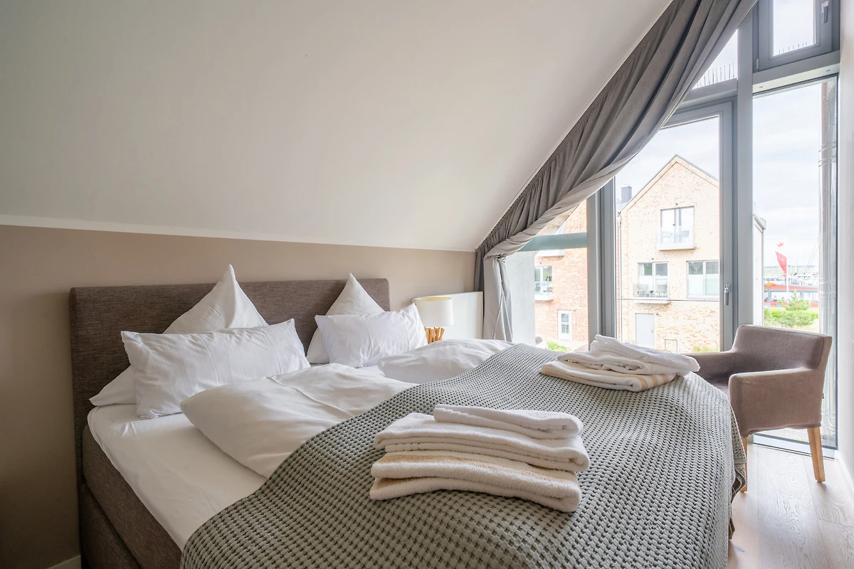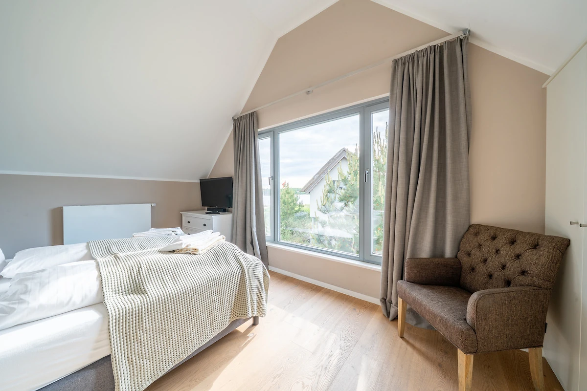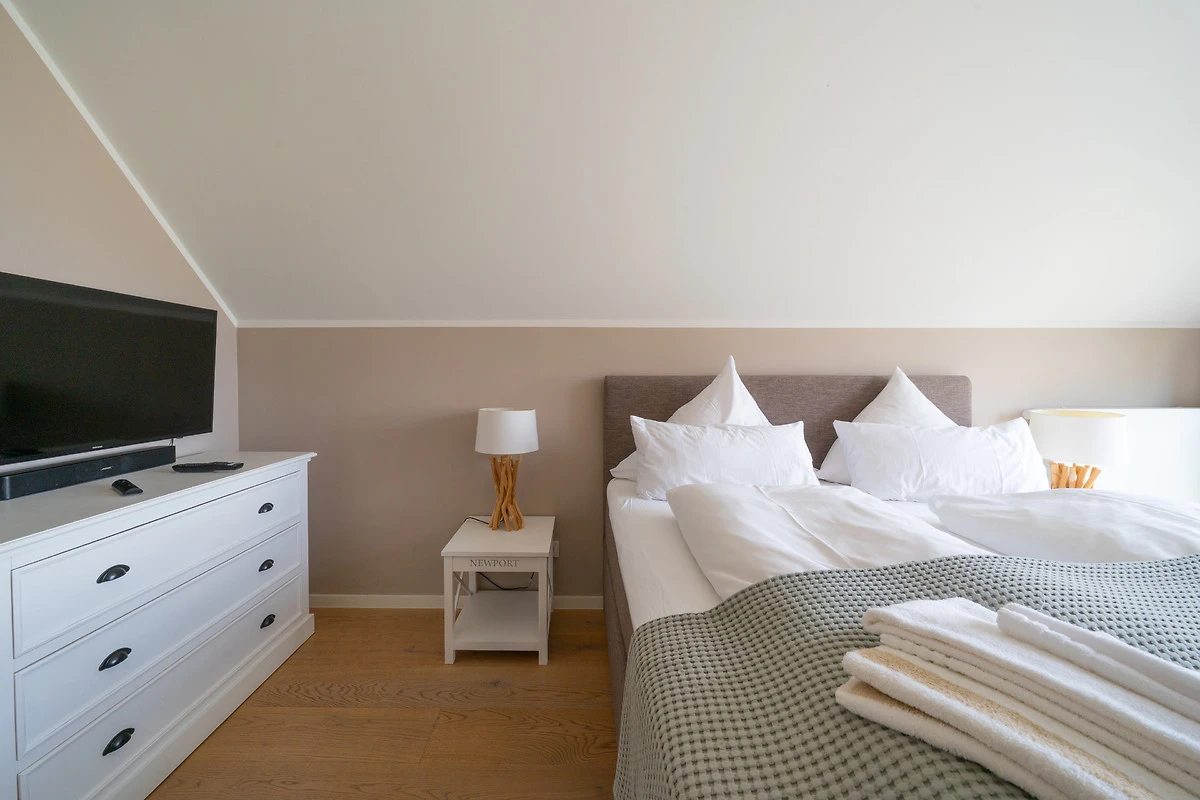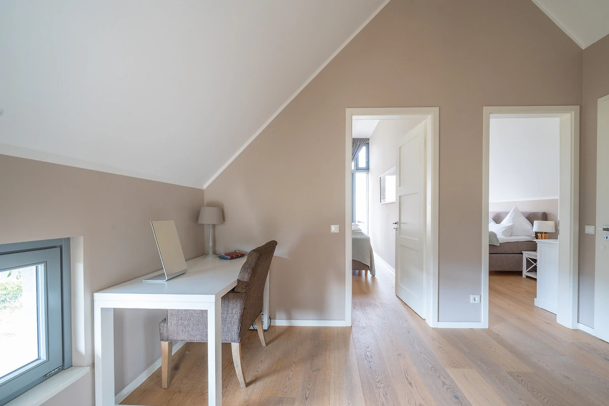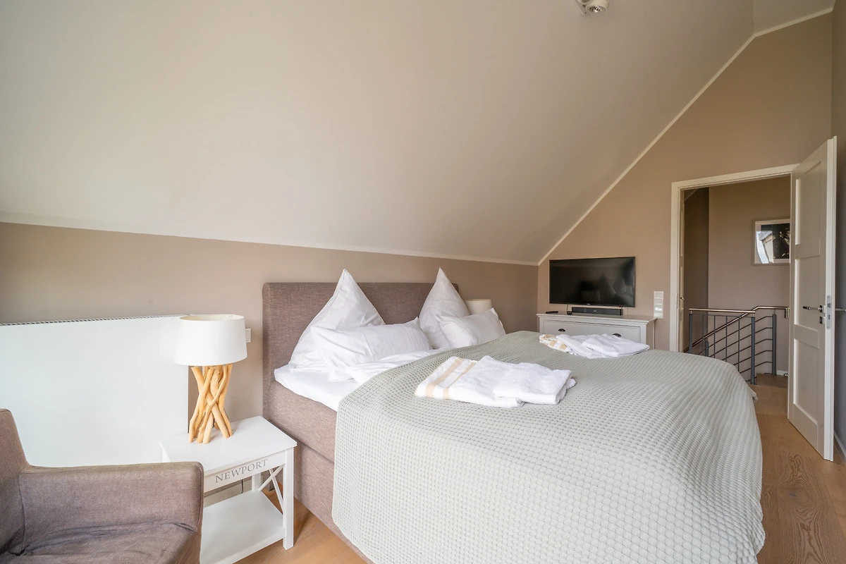 Im Obergeschoss warten drei helle Schlafräume und ein grosses Bad auf Sie. 2 Schlafzimmer gewähren einen Blick auf den Segelhafen, von dem dritten Schlafzimmer hat man einen schönen Blick auf den Binnensee. Das exklusive Badezimmer ist schön ausgestattet und verfügt über eine grosse Dusche und eine Badewanne zum Entspannen für ruhige Mussestunden.