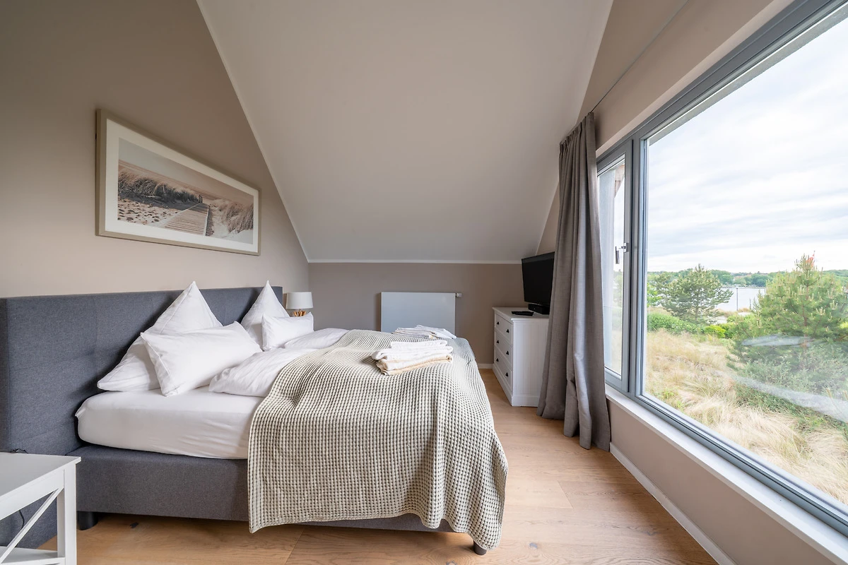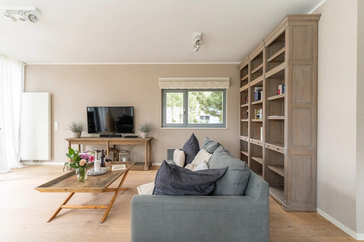 Im Erdgeschoss empfängt Sie ein grosszügiger Wohnbereich mit Kaminofen, Fernseher und bequemen Sofamöbeln. Durch die grosse Glasfront im Wohnraum haben Sie einen tollen Blick auf die Sonnenterrasse (30 qm), die zum Sonnenbaden, Ausruhen und Verweilen, aber auch zum Grillen und Beisammensein einlädt. Hinzu kommt ein toller Blick von der Sonnenterrasse und vom Wohnzimmer auf den Segelhafen.
