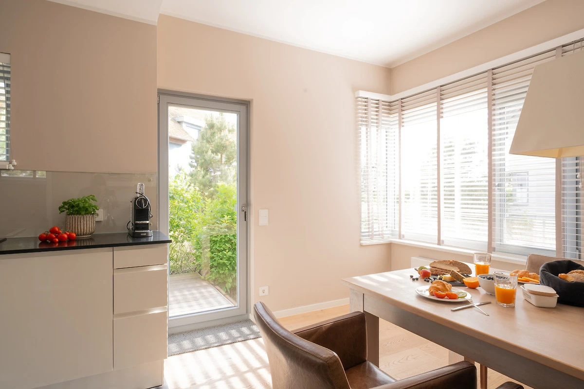 Im hinteren Bereich des Erdgeschosses erwartet Sie eine voll ausgestattete Küche mit einem grosszügigen Esssitzbereich für 6 Personen. Hinzu kommt noch ein Garderoben-Bereich und ein Gäste-WC.