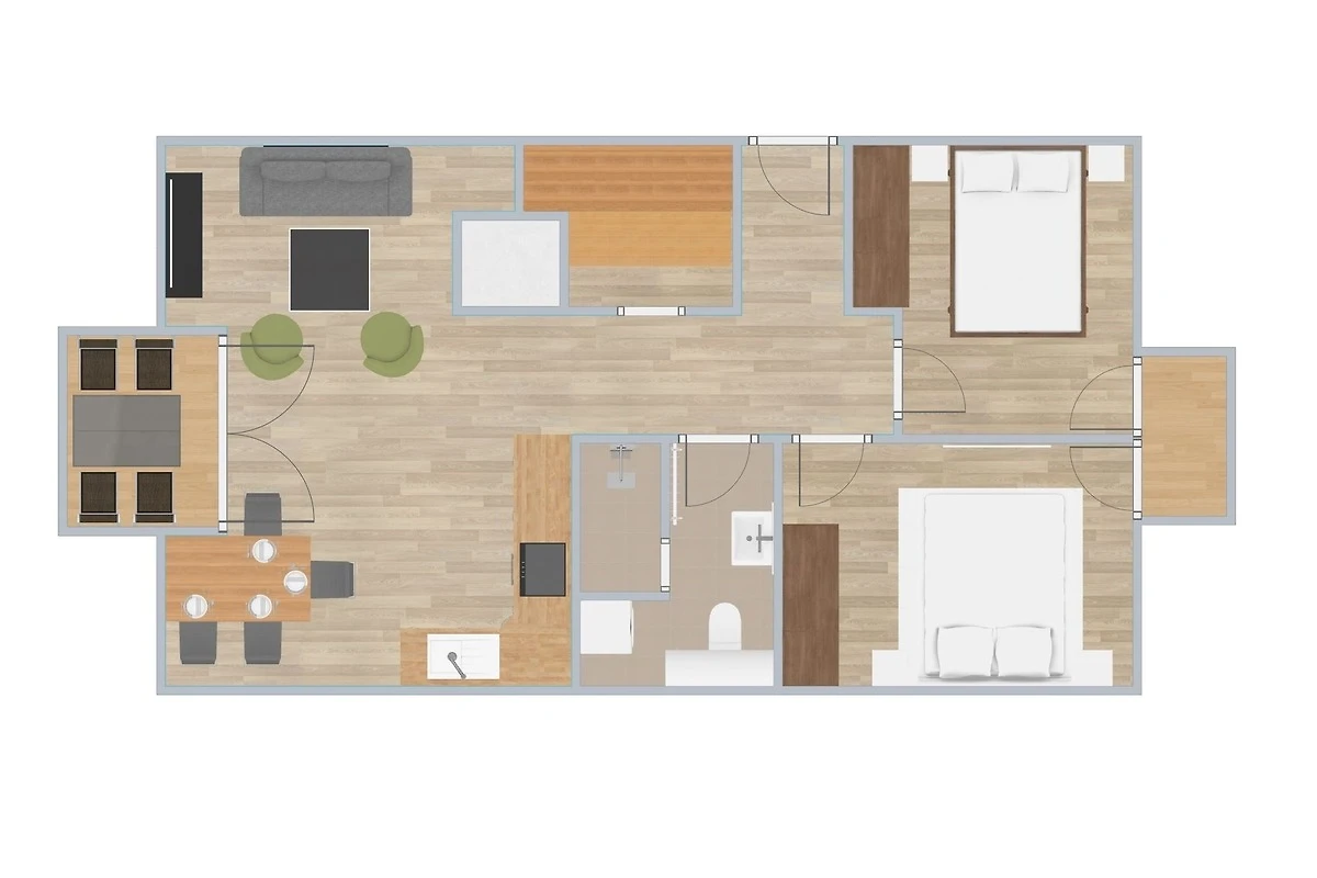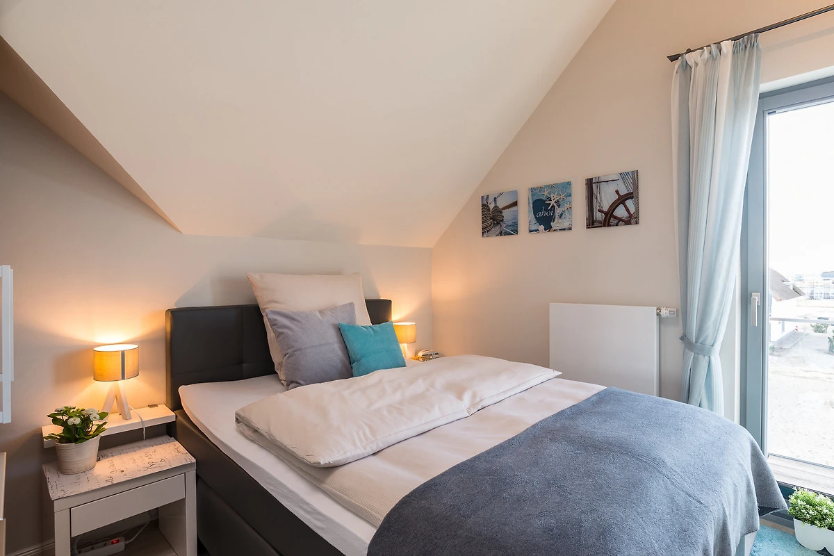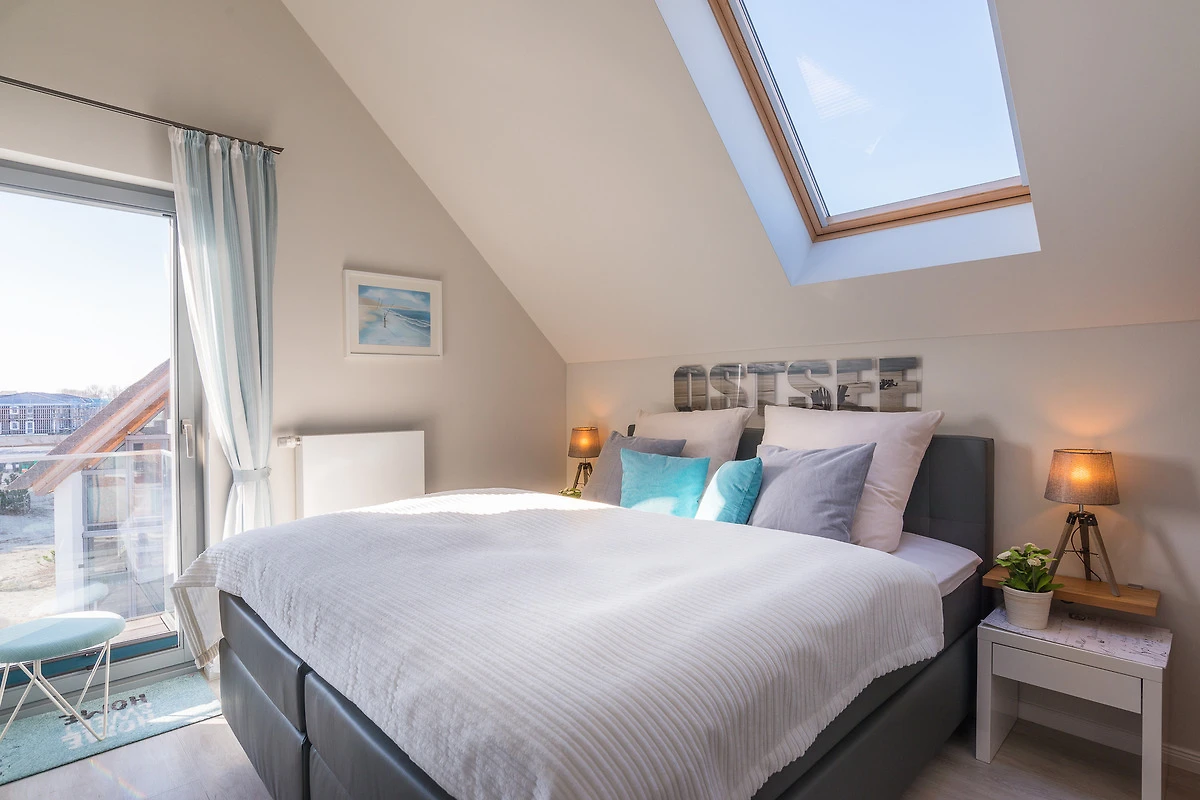 Die 2 Schlafzimmer sind mit komfortablen Boxspringbetten (1,80 x 2,00 m und 1,40 x 2,00 m) ausgestattet. Im grösseren Schlafraum ist zusätzlich ein grosser Flachbildfernseher vorhanden. Beide Schlafzimmer, die sich auf der vom Yachthafen abgewandten Seite befinden, sorgen durch Verdunklungs-Plissee-Anlagen und einem elektronischen Dachfensterrollo für einen erholsamen Schlaf. Ein Kinderreisebett ist ebenfalls vorhanden.