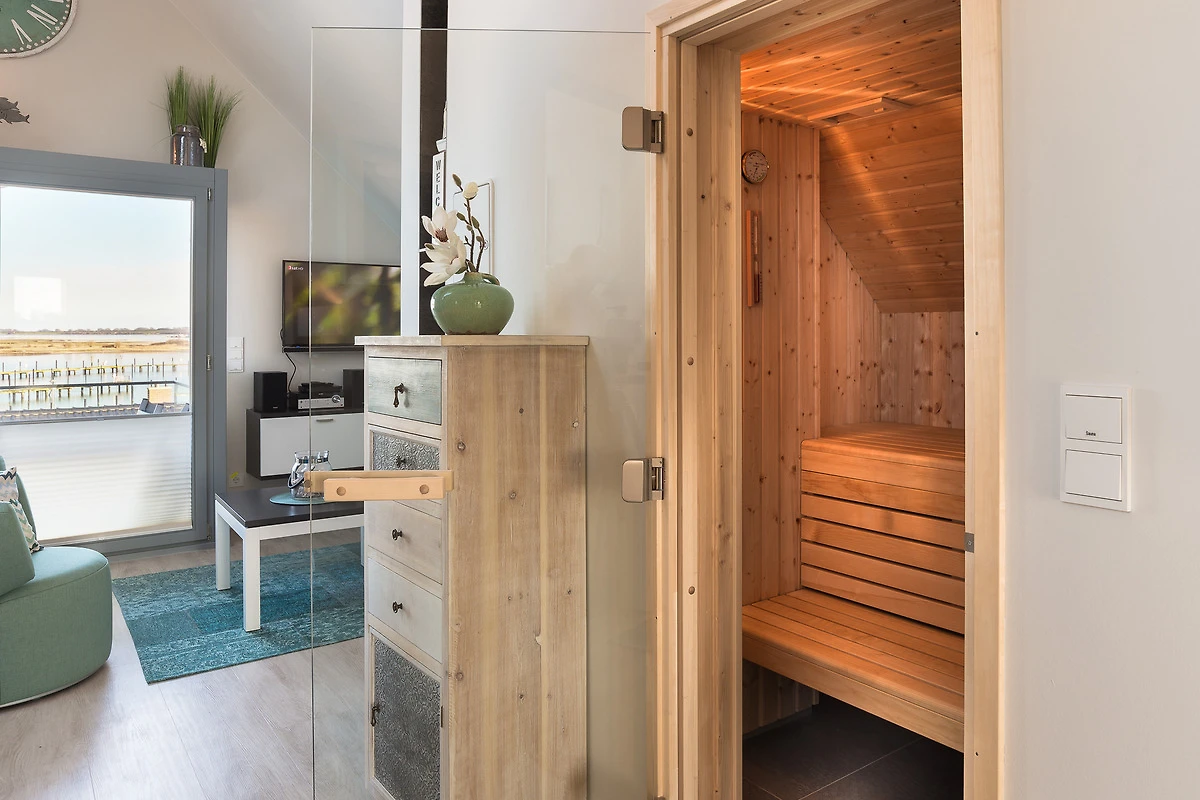 Unmittelbar gegenüber dem Bad befindet sich die gemütliche Sauna mit heller Fichtenholzausstattung.