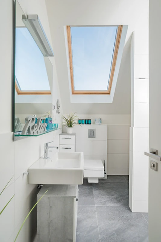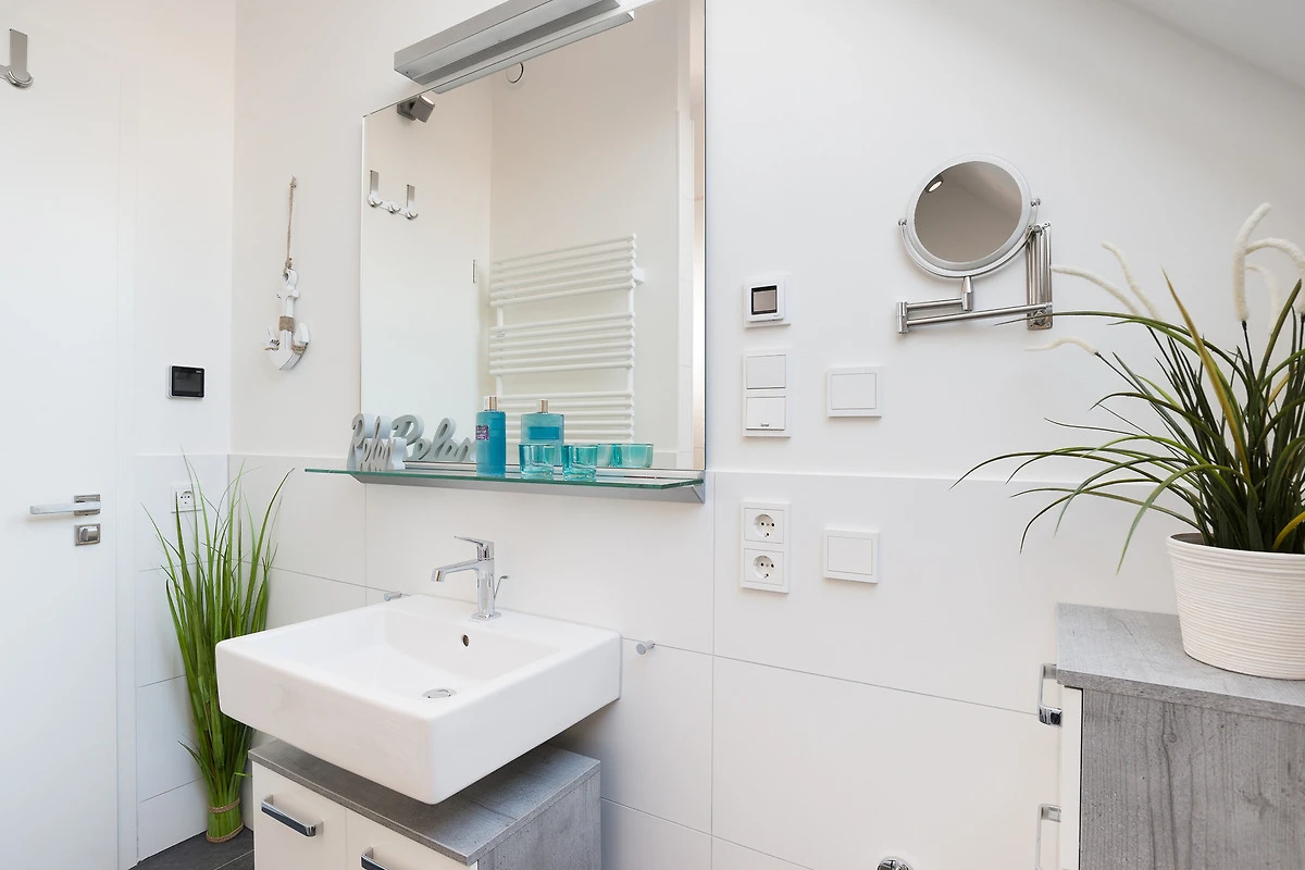 Das Duschbad ist mit einer Fussbodenheizung, einem Handtuchwärmer, begehbarer Dusche mit Regenbrause und einem kombiniertem Wasch-Trockner versehen.