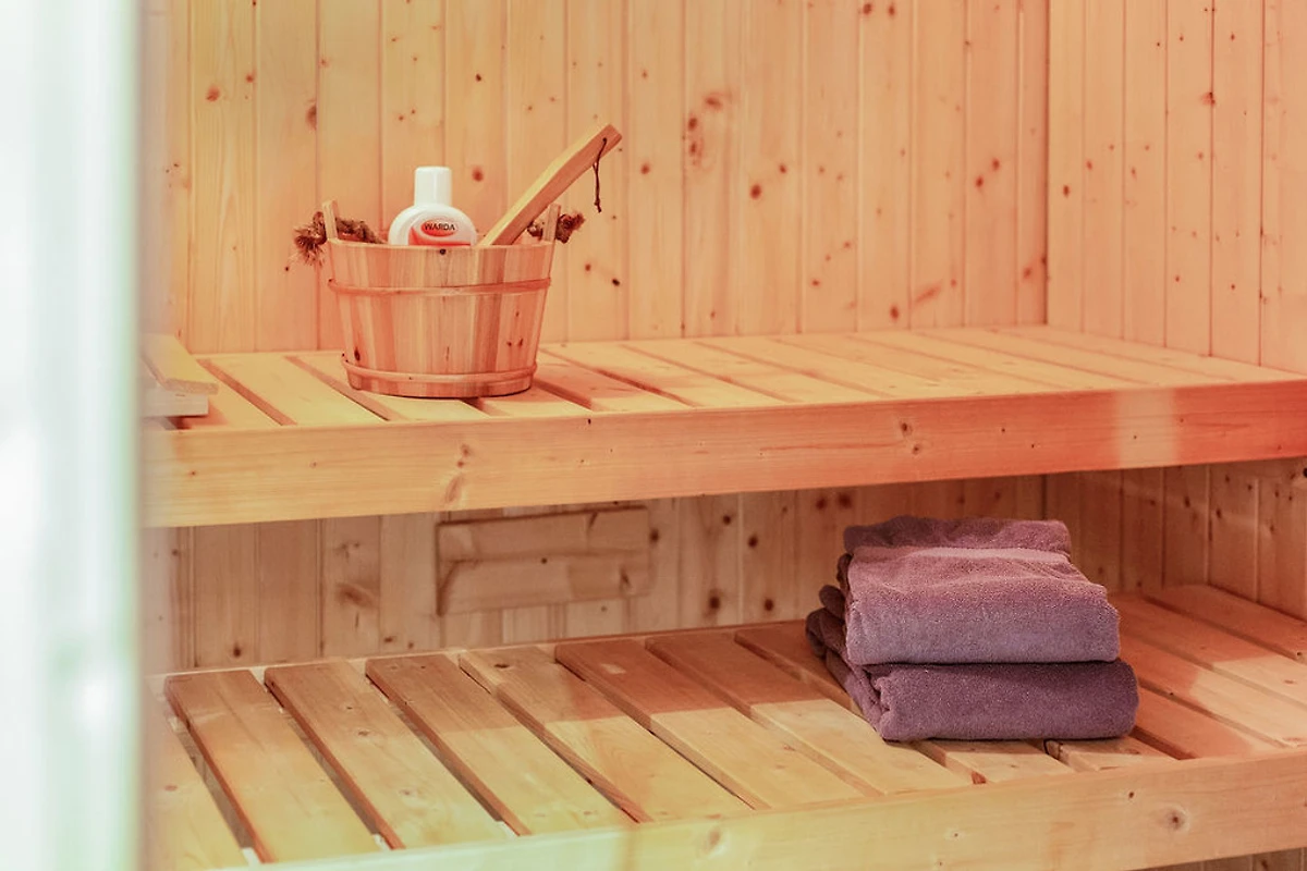 • 1 Wellnessbad mit Sauna, Wellnessliegen, grosse ebenerdiger Dusche, Whirlpool