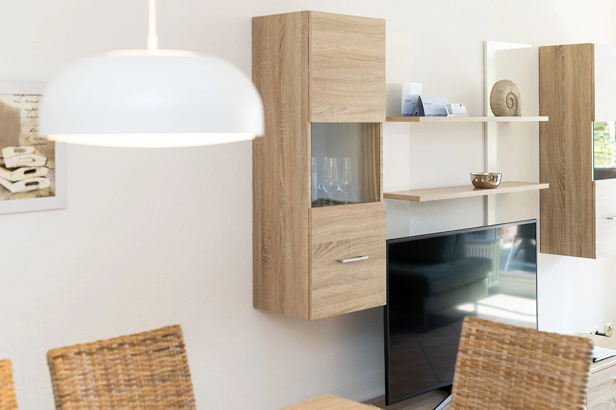 Geniessen Sie die komfortable Grösse dieser modern eingerichteten Ferienwohnung mit geräumiger Terrasse zur Süd-Westseite, offenem Wohnraum mit grossem Esstisch, Wohnlandschaft mit moderner Smart-TV-Wand und neu verbauter Komfort-Küche. Fussböden sind gefliest.
