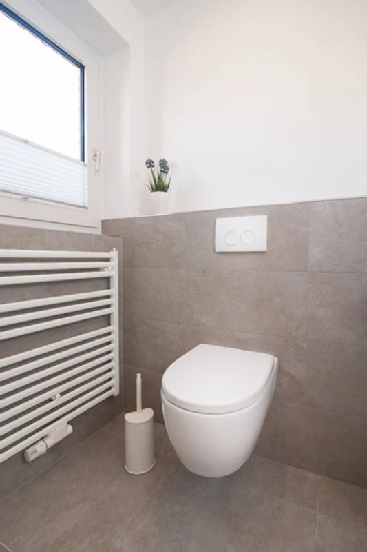 Auch im Flur bietet ein weiterer Schrank genügend Platz. Das Duschbad wird durch ein Fenster vom Tageslicht erhellt.