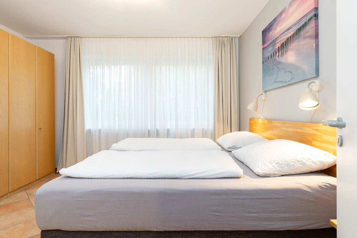 Das Schlafzimmer besteht aus einem Doppelbett (Boxspring, je 90x200 cm) und 4-türigem Kleiderschrank.
