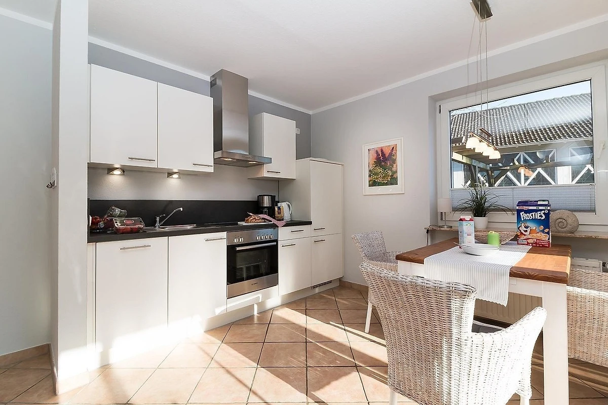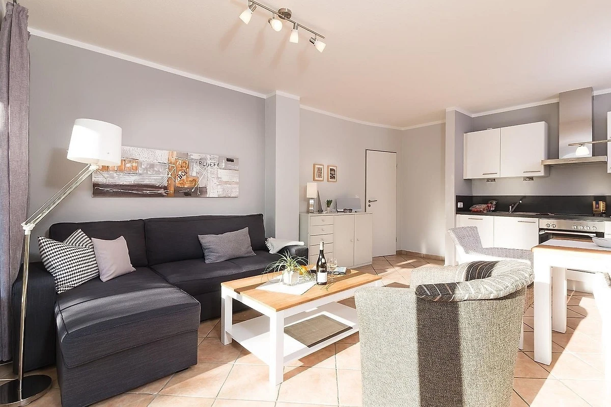 Der Wohnbereich hat von zwei Seiten Fenster und ist dadurch besonders hell, eingerichtet mit einer ansprechenden Küchenzeile, Essplatz, direkt am Fenster mit Morgensonne, Schlaf-Sofa mit stilvollem Sessel geben dem Apartment eine besonders modische Note. Der Fussboden ist terracotta-farben gefliest.