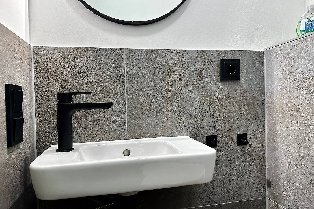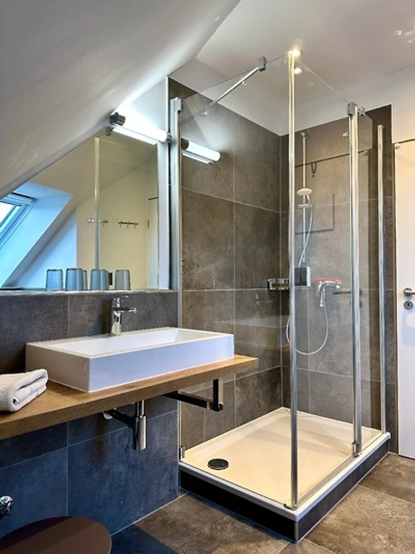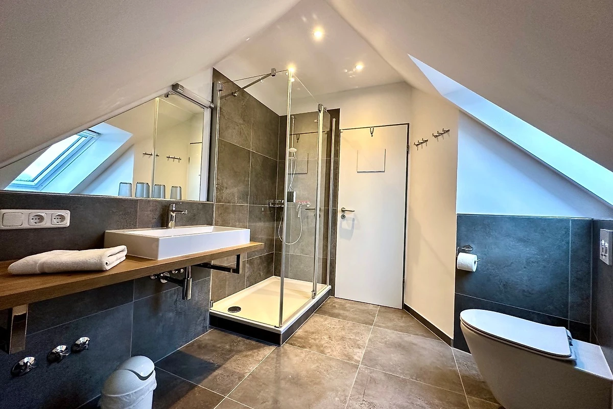 Das anliegende, geräumige Duschbad wurde 2023 komplett neu gestaltet. Das moderne Design kommt durch ein Dachflächenfenster mit reichlich Tageslicht besonders ansprechend zur Geltung.