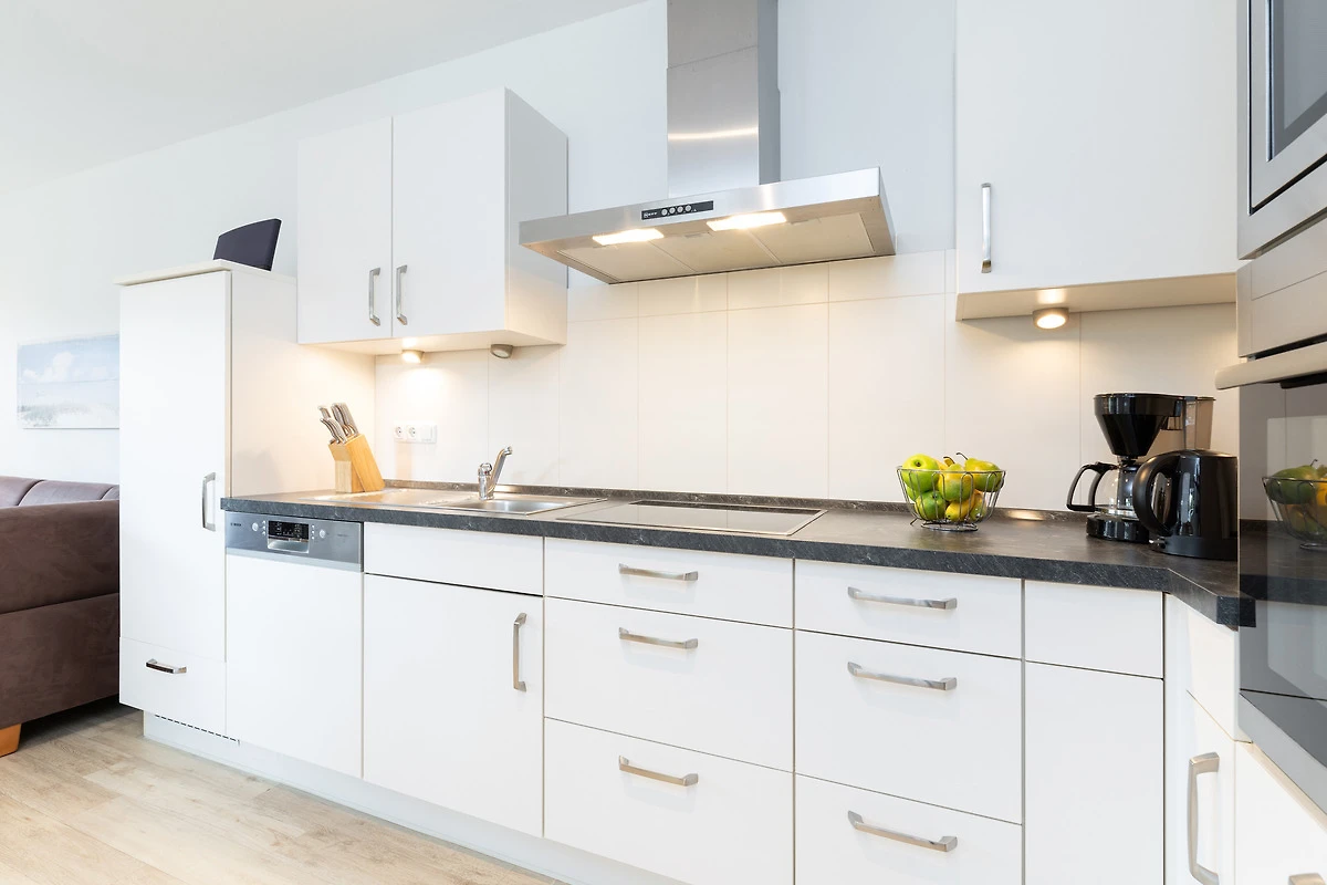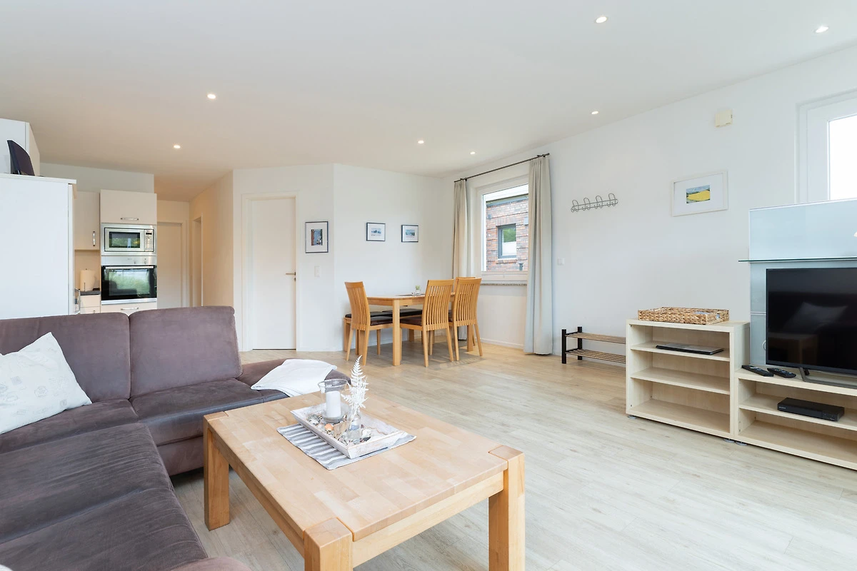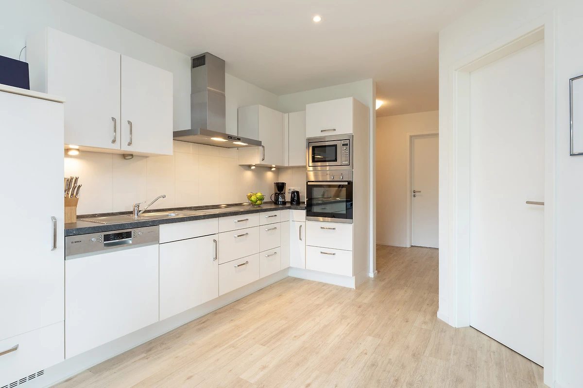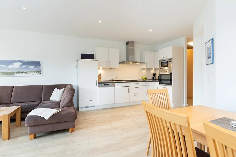 Treten Sie ein in Ihr Apartment und spüren Sie sofort Urlaubsfreude. Ihr Blick fällt direkt auf die offene Winkelküche mit modernsten Elektrogeräten auch für gehobene Qualitätsansprüche. Die Naturholz-Esstisch-Gruppe mit Bank und Stühlen wirkt warm und einladend. Von der Sofaecke mit Schlaffunktion geniessen Sie den Blick ins Grüne. Flachbild-TV und Regal bieten eine harmonische Raumtrennung.