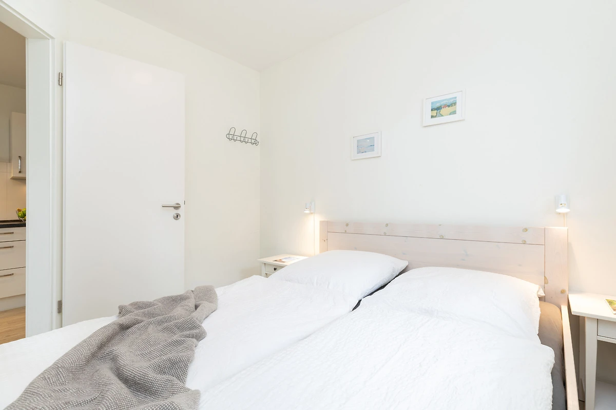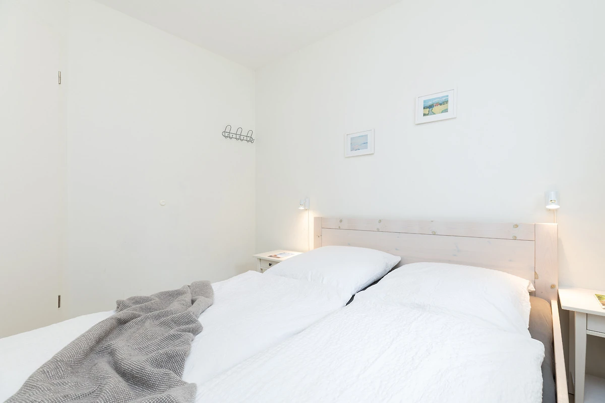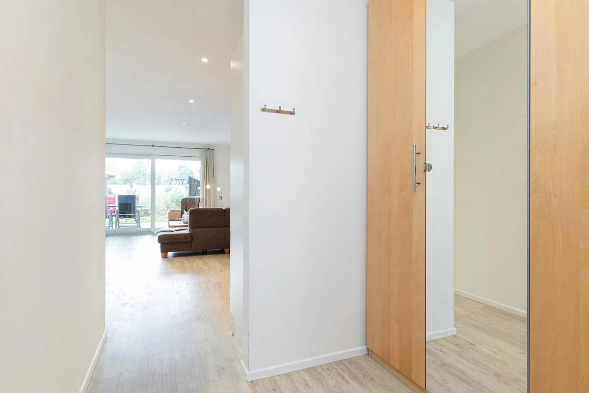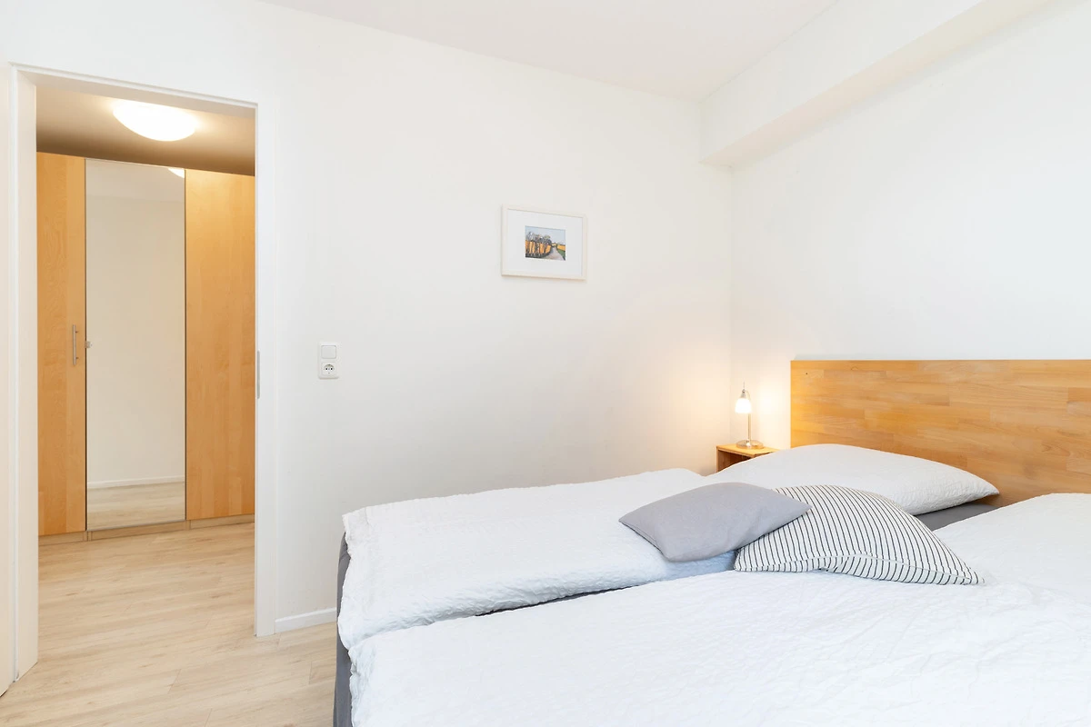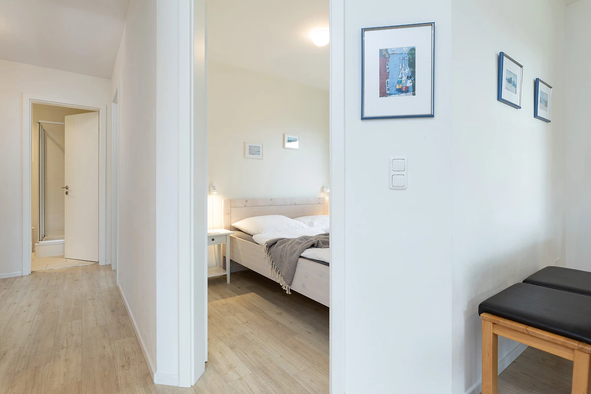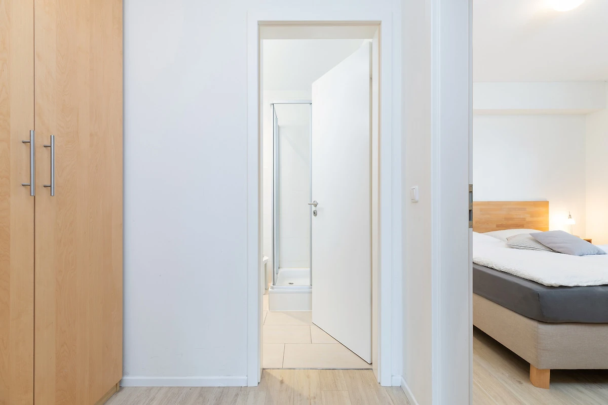 Der Flurbereich mit grossem Schrankelement bietet genügend Stauraum. Von hier aus gehen Sie in zwei Schlafräume mit je 2 Betten - einmal 90 x 200 cm und einmal 80 x 200 cm. Das Bad ist sandfarben gefliest und weisse Objekte mit Accessoires, Handtuch-Heizkörper sowie Echtglasdusche verleihen dem Raum Moderne.