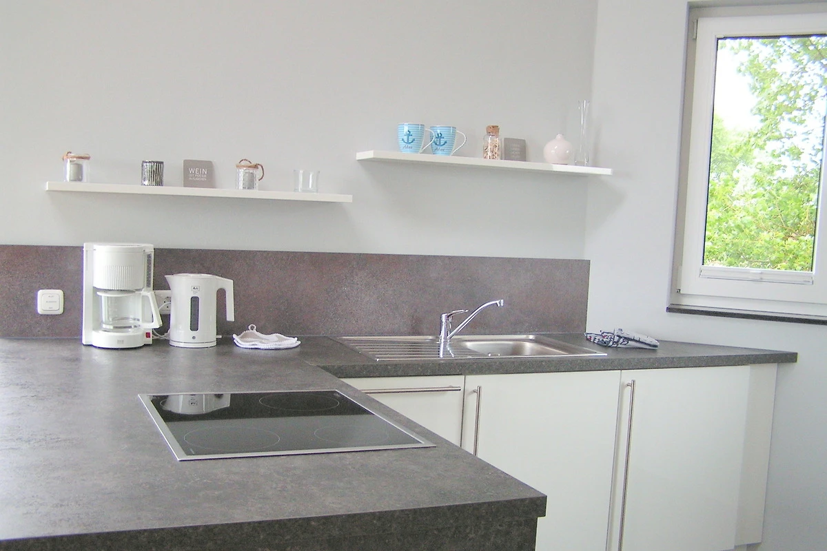 Im Obergeschoss befinden sich die voll eingerichtete Küchenzeile mit Ceran-Kochfeld, Backofen und Geschirrspüler sowie ein amerikanischer Kühlschrank mit Eiswürfelbereiter und Wasserspender. Von der gemütlichen Sitzecke aus haben Sie einen tollen Panoramablick auf Dünen, Meer und Fehmarnsundbrücke.