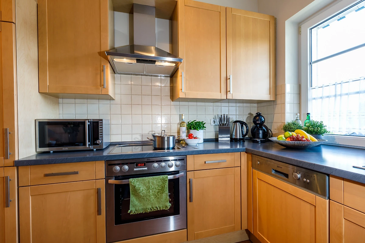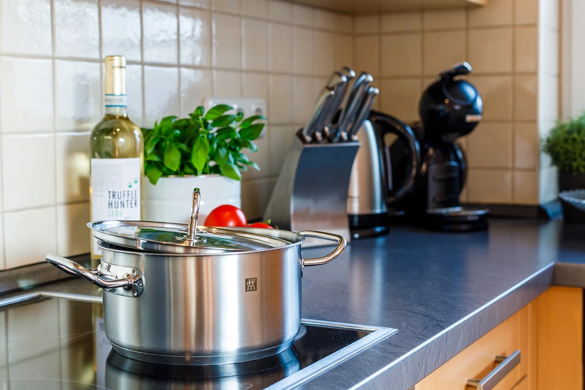 Die Wohnung verfügt über einen gemütlichen Schlafraum mit einem komfortablen Doppelbett, ideal für erholsame Nächte. Im einladenden Wohnzimmer erwartet Sie ein stilvolles Lederschlafsofa, das sich perfekt für entspannte Abende eignet. Die komplett ausgestattete Küchenzeile lässt keine Wünsche offen: Hier finden Sie alles, was Sie für die Zubereitung Ihrer Lieblingsgerichte benötigen, von der Spülmaschine über den Kühlschrank mit Gefrierfach bis hin zu modernen Geräten wie Cerankochfeld, Backofen, Mikrowelle, Kaffeemaschine und sogar einer Dolce Gusto Kapselmaschine für den perfekten Kaffeegenuss.
