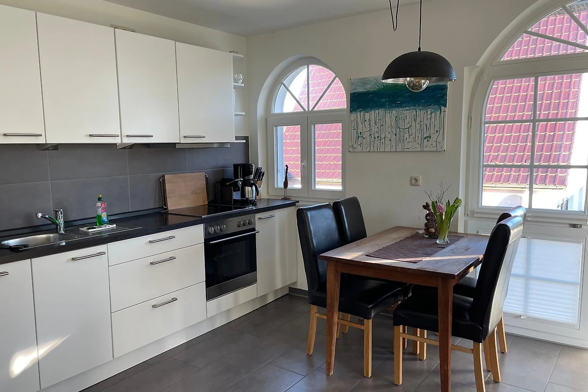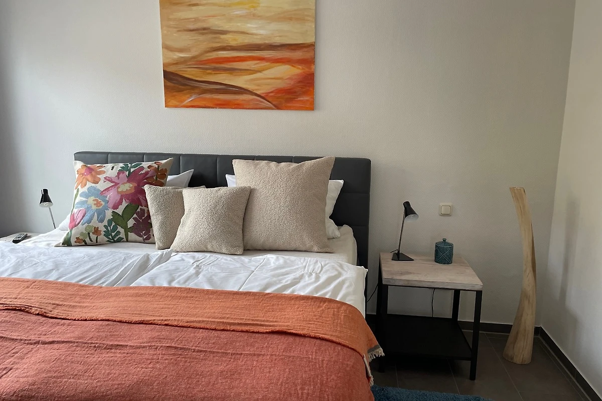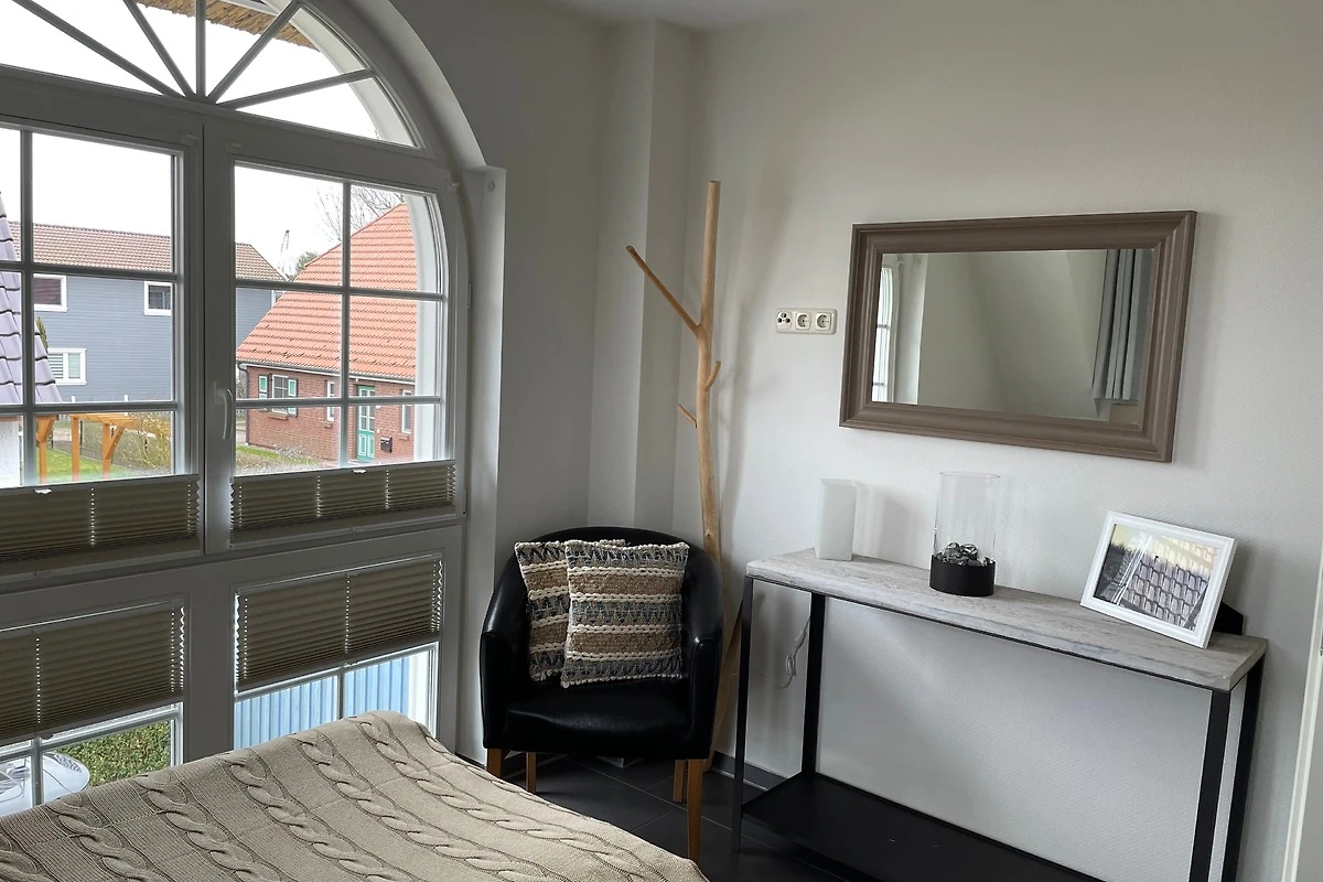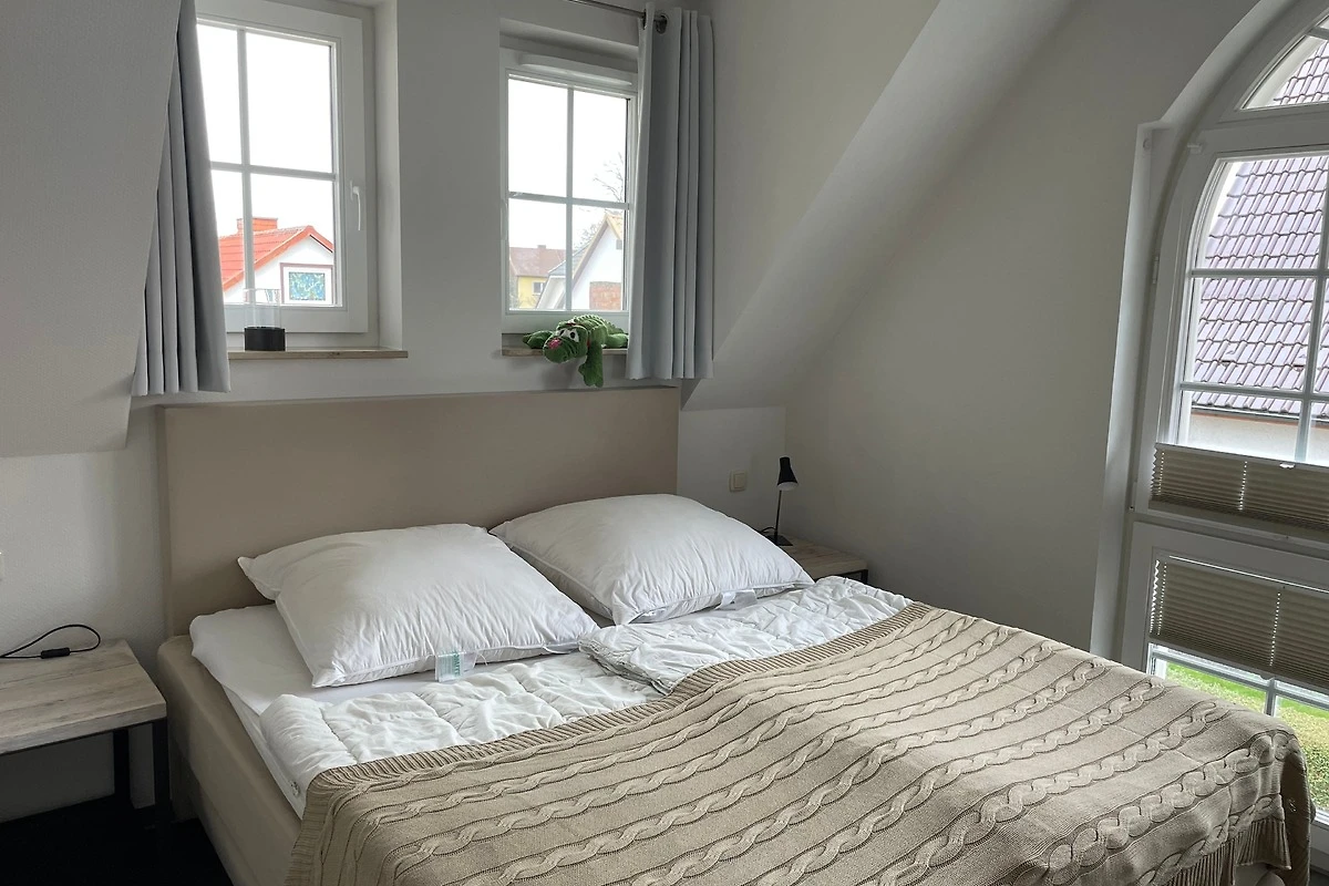 Die Ferienwohnung ist ausgestattet mit einem Wohnraum, zwei Schlafräumen (1x Doppelbett , 1x Futonbett (160 cm breit)), einer komplett eingerichteten