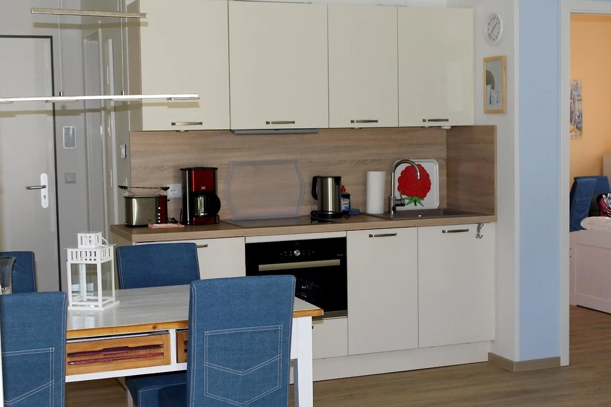 Die moderne gut ausgestattete Küchenzeile mit Kühl/Gefrierschrank,Ceranherd mit Backofen,Geschirrspüler, Wasserkocher,Toaster und Kaffeemaschine ist in dem Wohnraum integriert.Davor befindet sich der grosszügige Essplatz.
