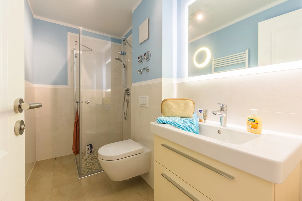 Das Badezimmer ist mit bodengleicher Dusche und modernen Badmöbeln ausgestattet. Im Schlafzimmer befindet sich ein hochwertiges Boxspringbett (180x200 cm). Im Waschraum der Hausanlage befinden sich Waschmaschine und Trockner (jeweils mit Münzautomat) zur Nutzung.